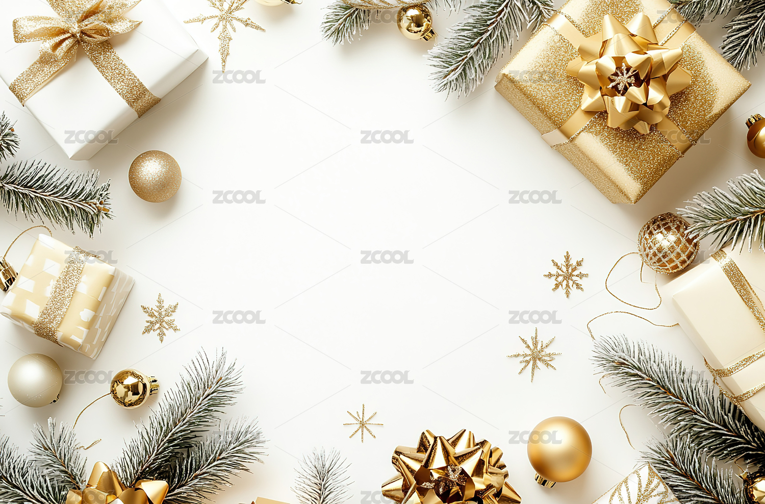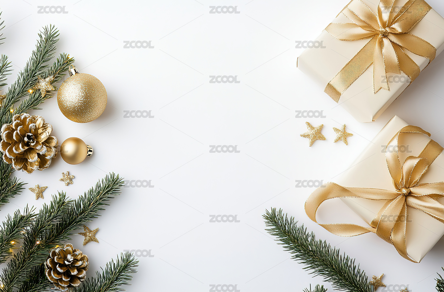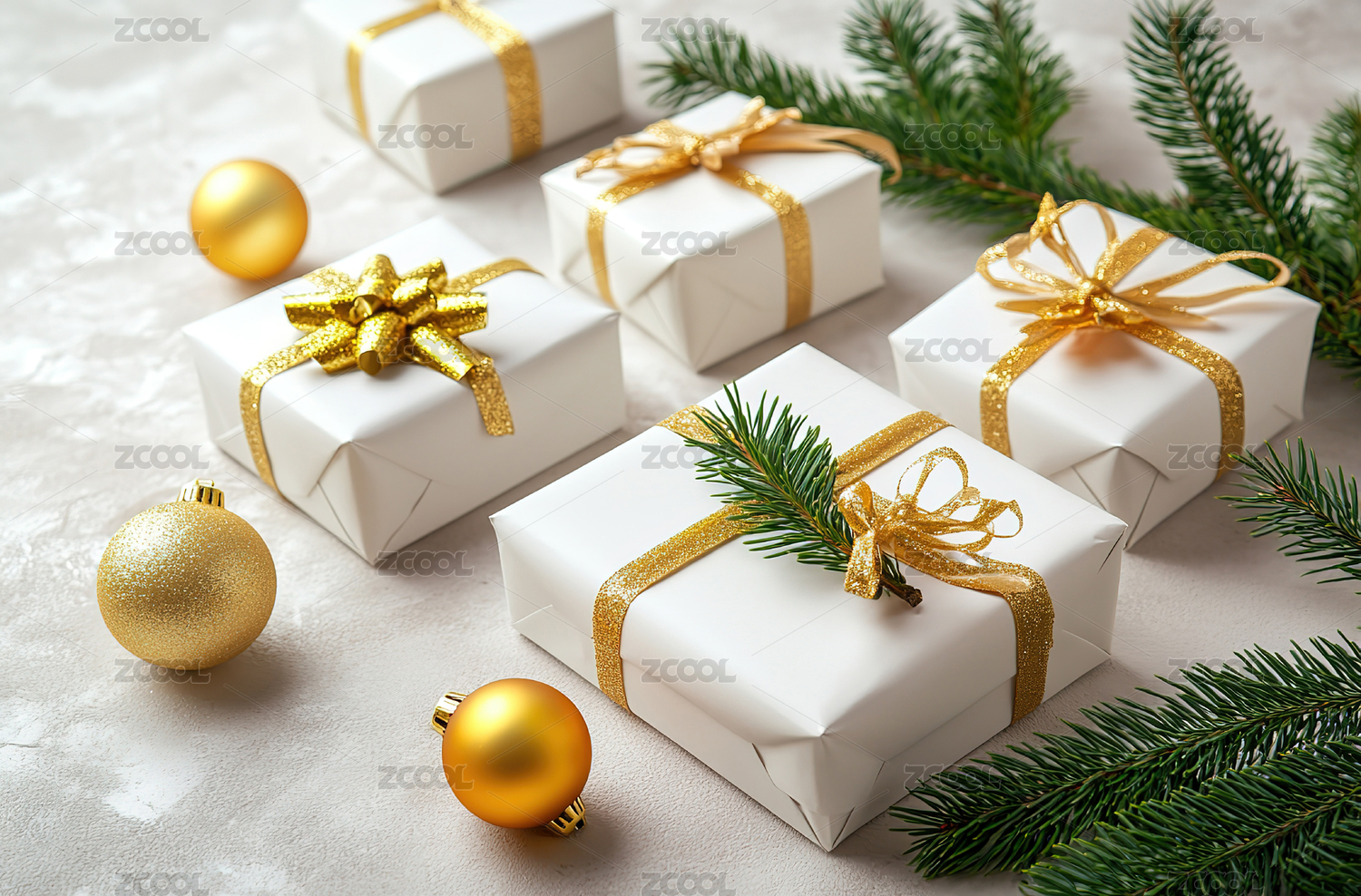 圣诞节,装饰,礼品盒,装饰品,白色背景,节日,季节性,金色,银色,松树枝