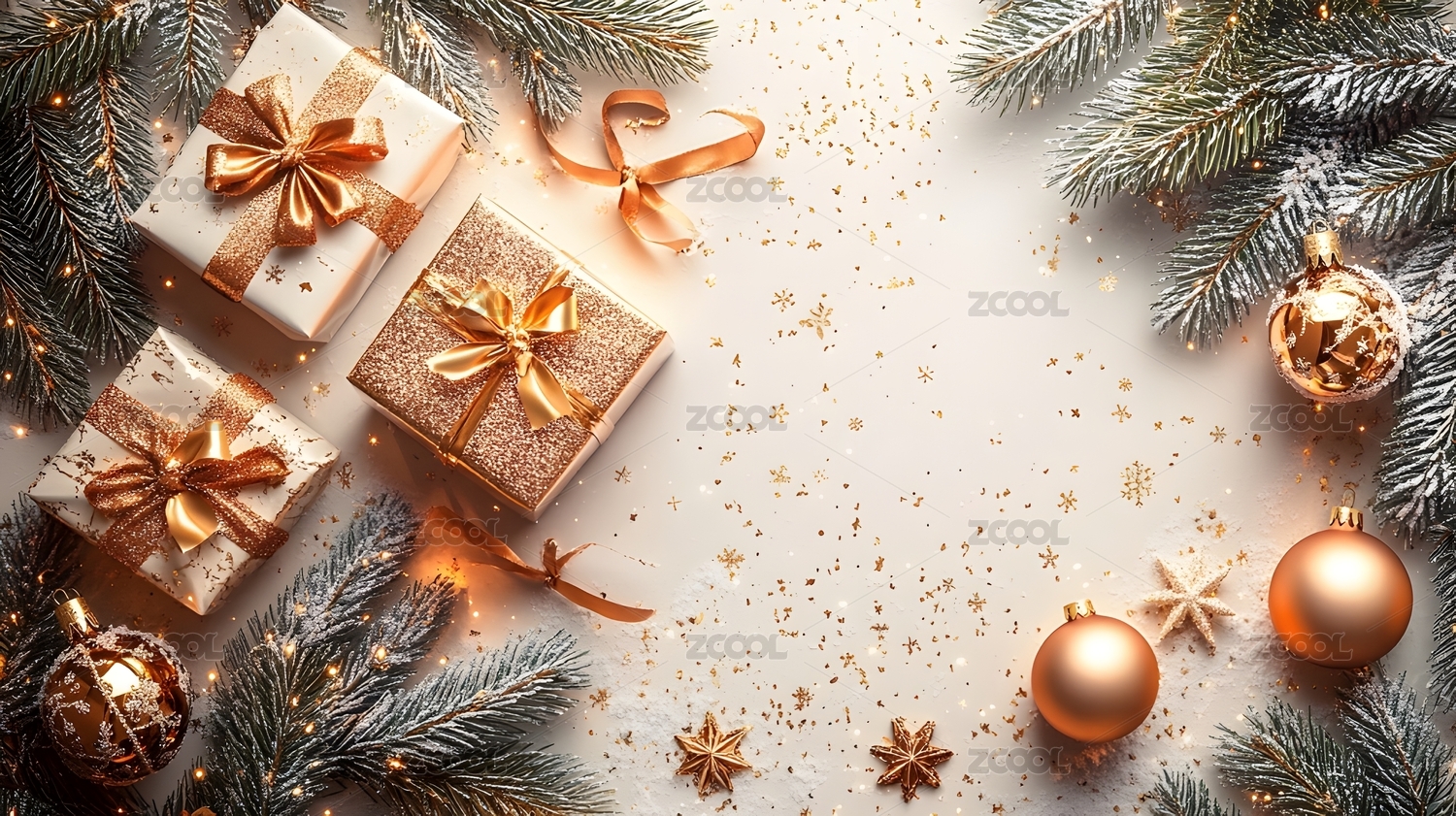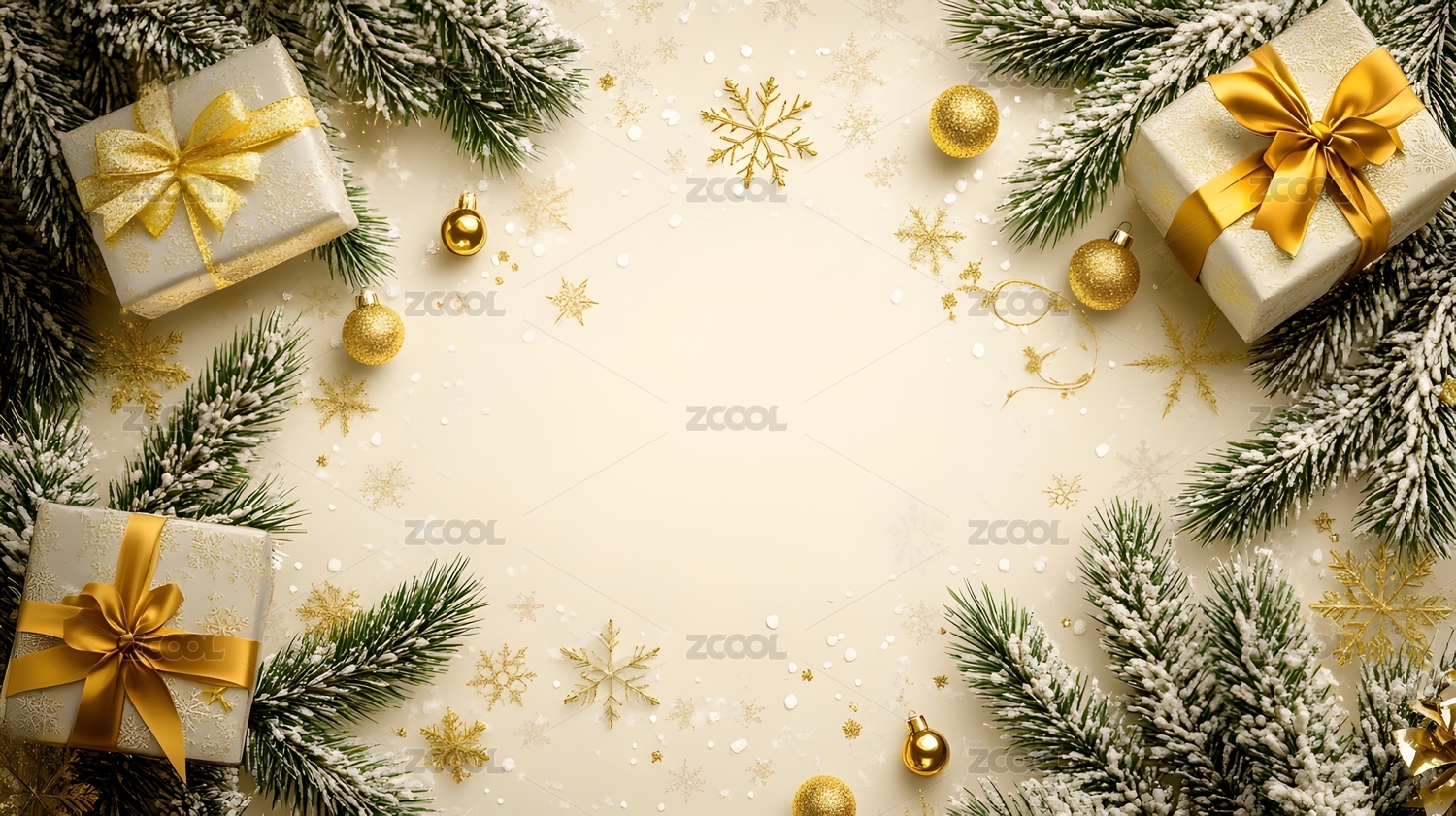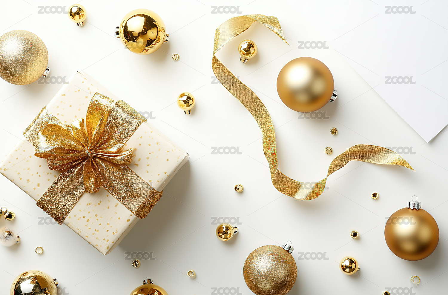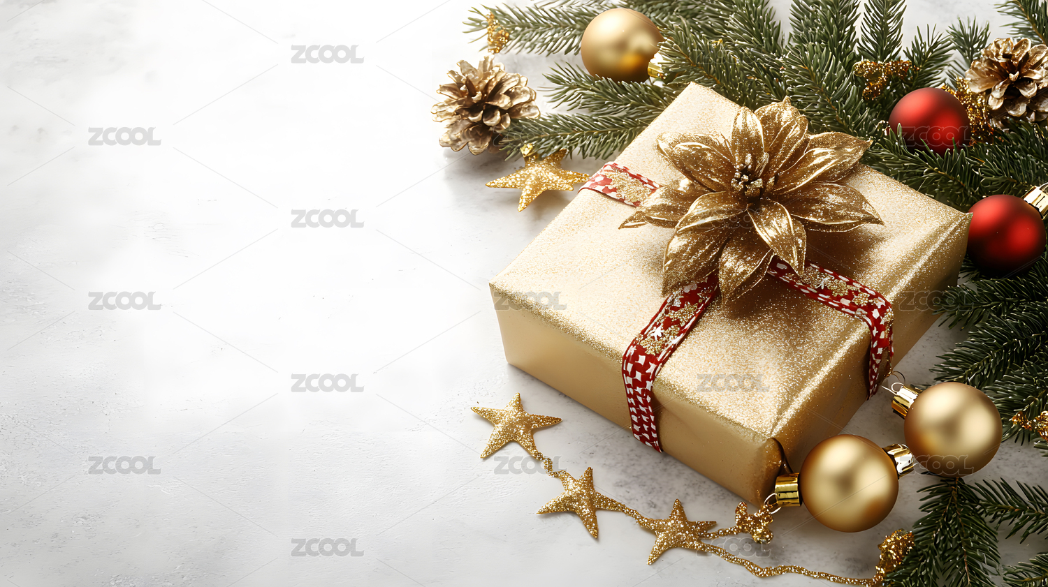 圣诞节,装饰,礼品盒,装饰品,白色背景,节日,季节性,金色,银色,松树枝