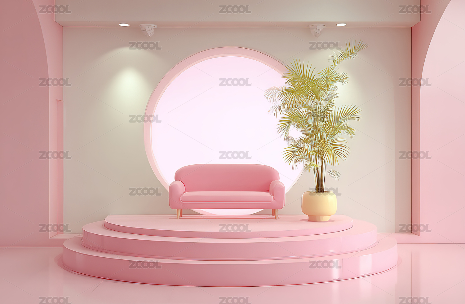 粉色,圆窗,椅子,植物,海洋,天空,白云,室内,现代,简约