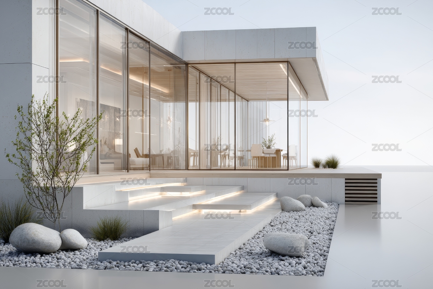 白天清新明亮现代单层别墅建筑局部插画绘画