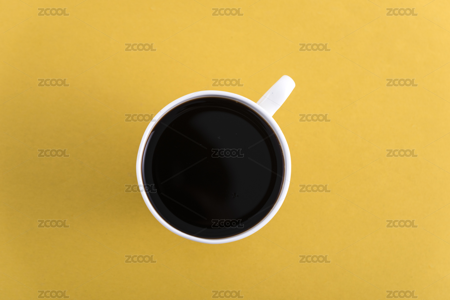 黄色背景上的一杯咖啡和咖啡豆创意摆拍