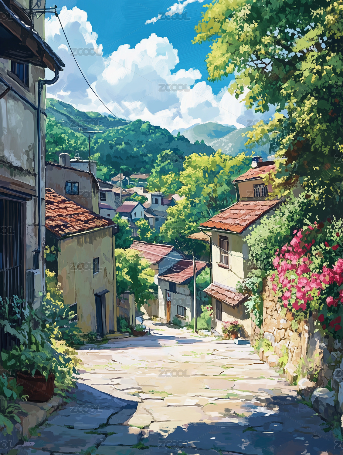 小镇建筑新海诚插画