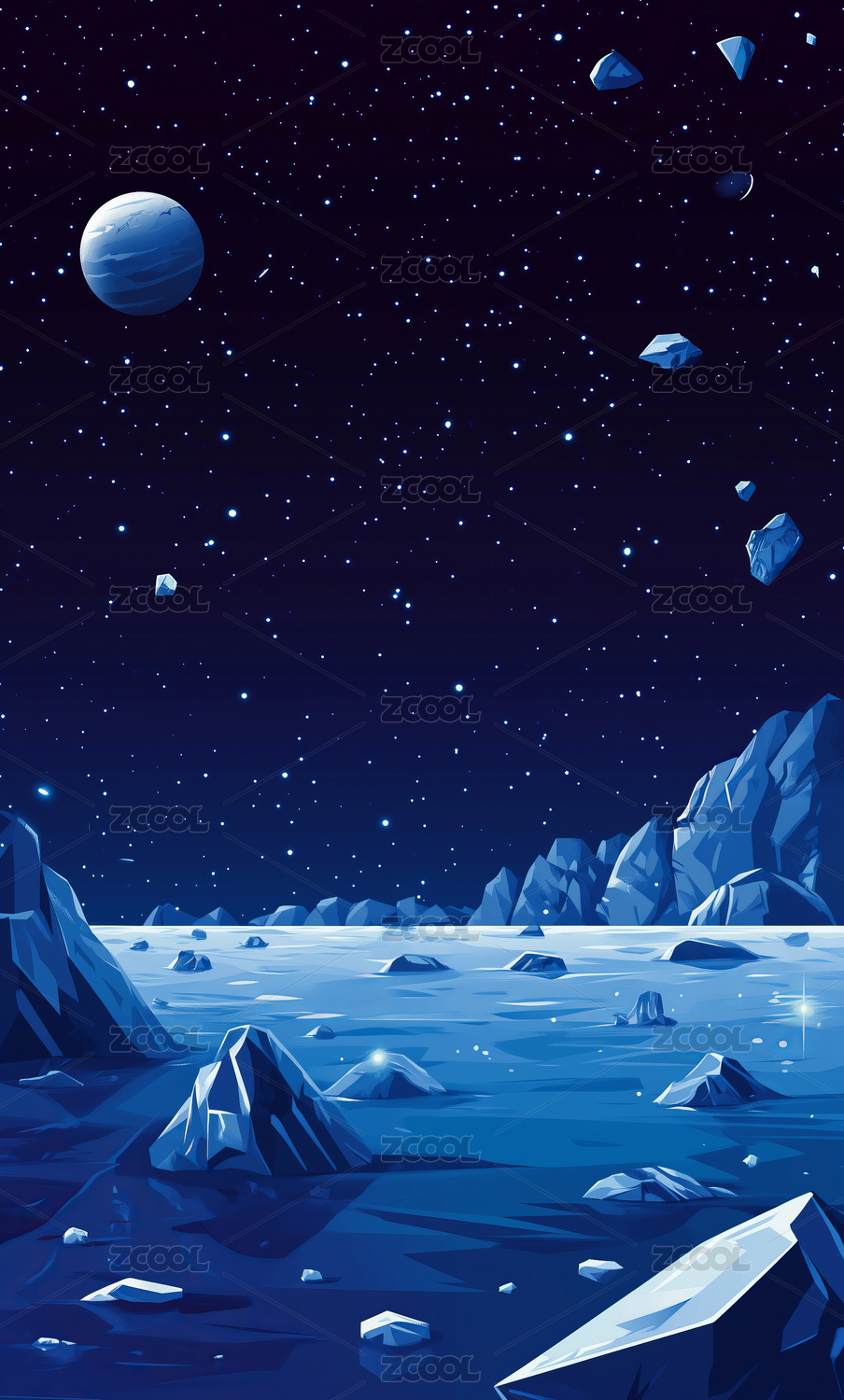 夜晚蓝色星空岩石风景插画
