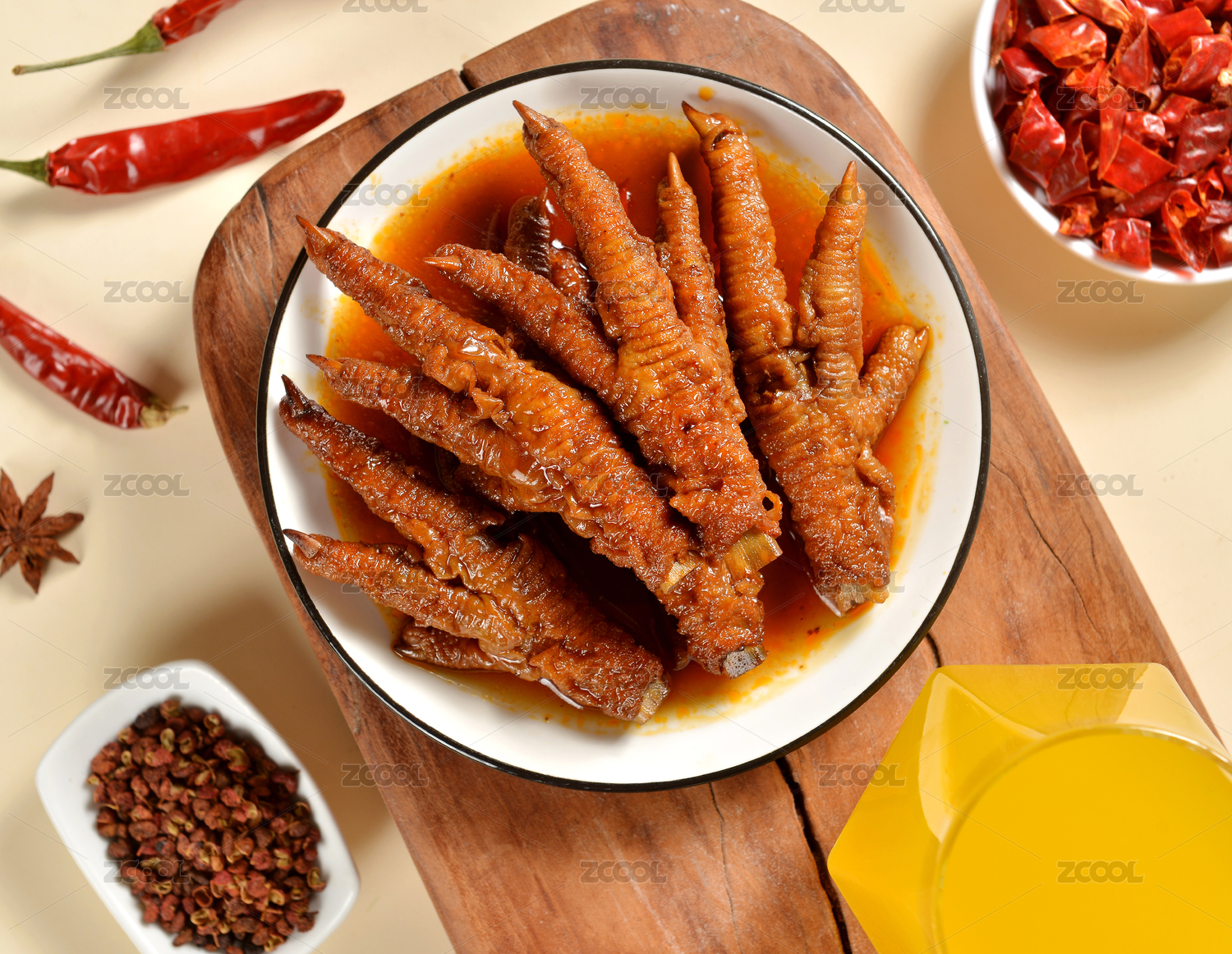 木板背景上的一盘麻辣鸡爪