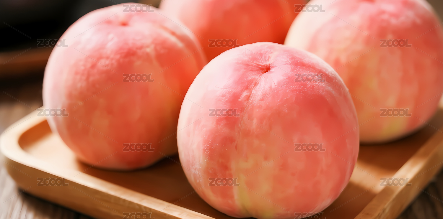 木纹背景木盘里咬了一口的新鲜脆甜桃子