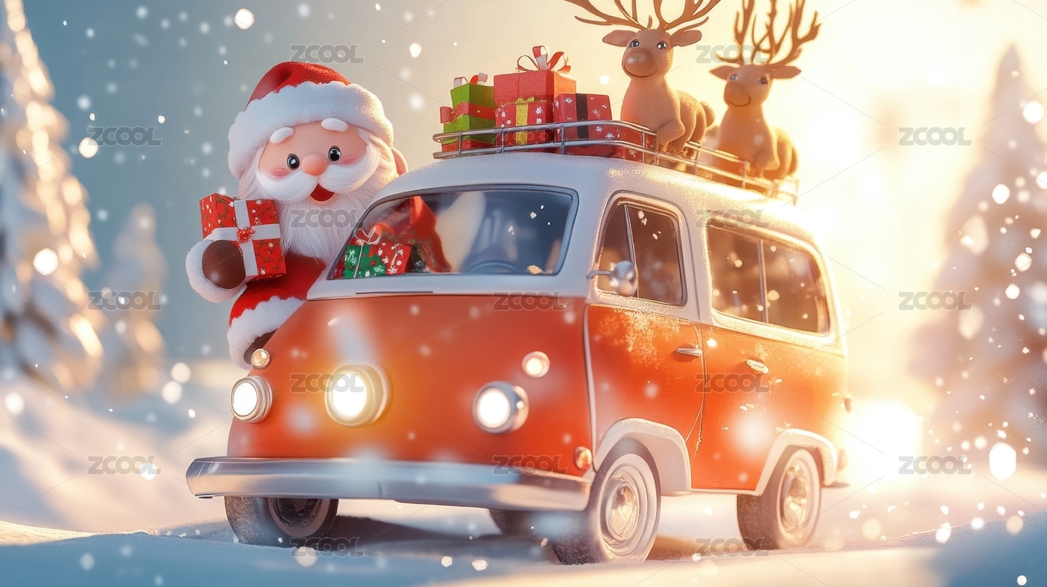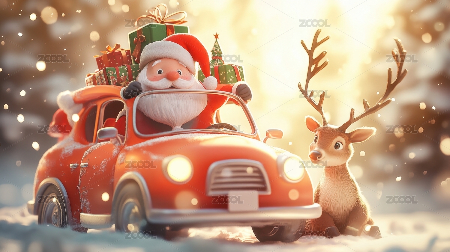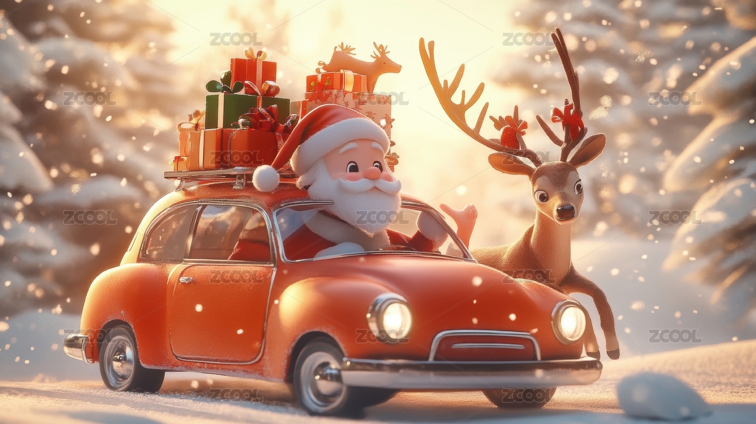 圣诞老人驾车送礼,雪景温馨节日氛围
