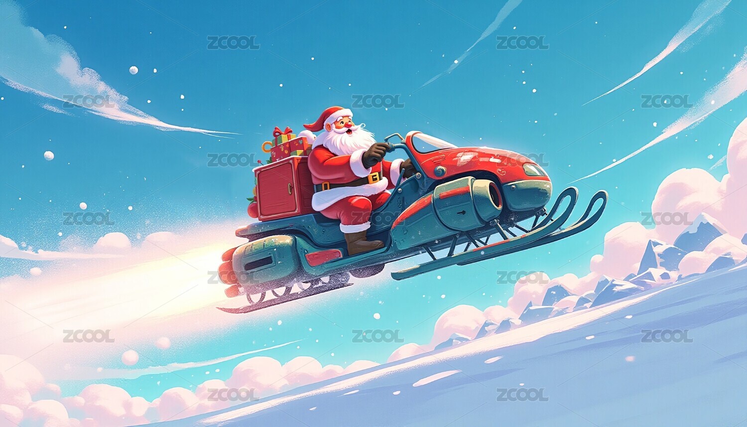 圣诞老人驾驶雪地摩托车飞跃雪地