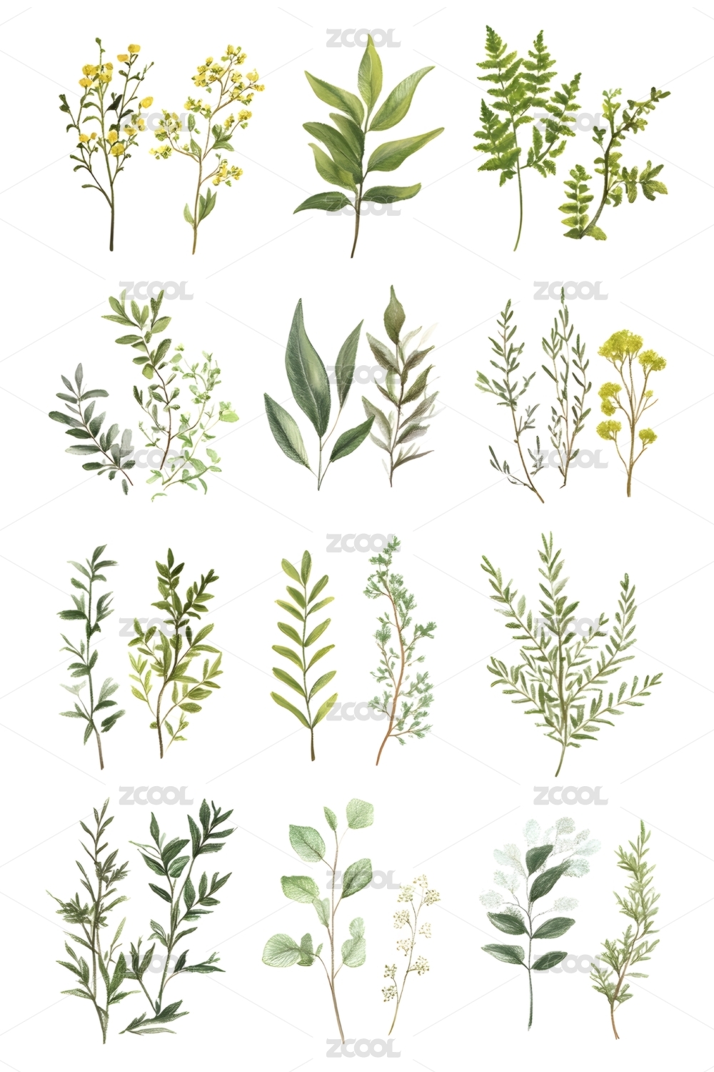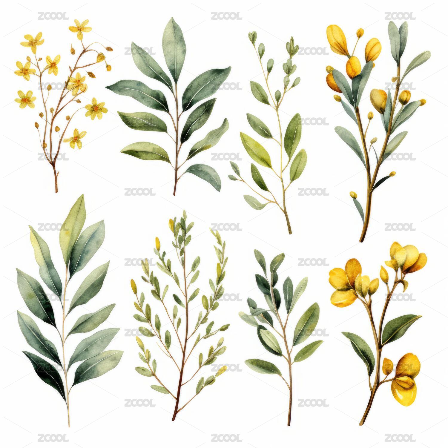 水彩,草药,剪贴画,集,叶,图案,花卉,绘画,纹理,清新