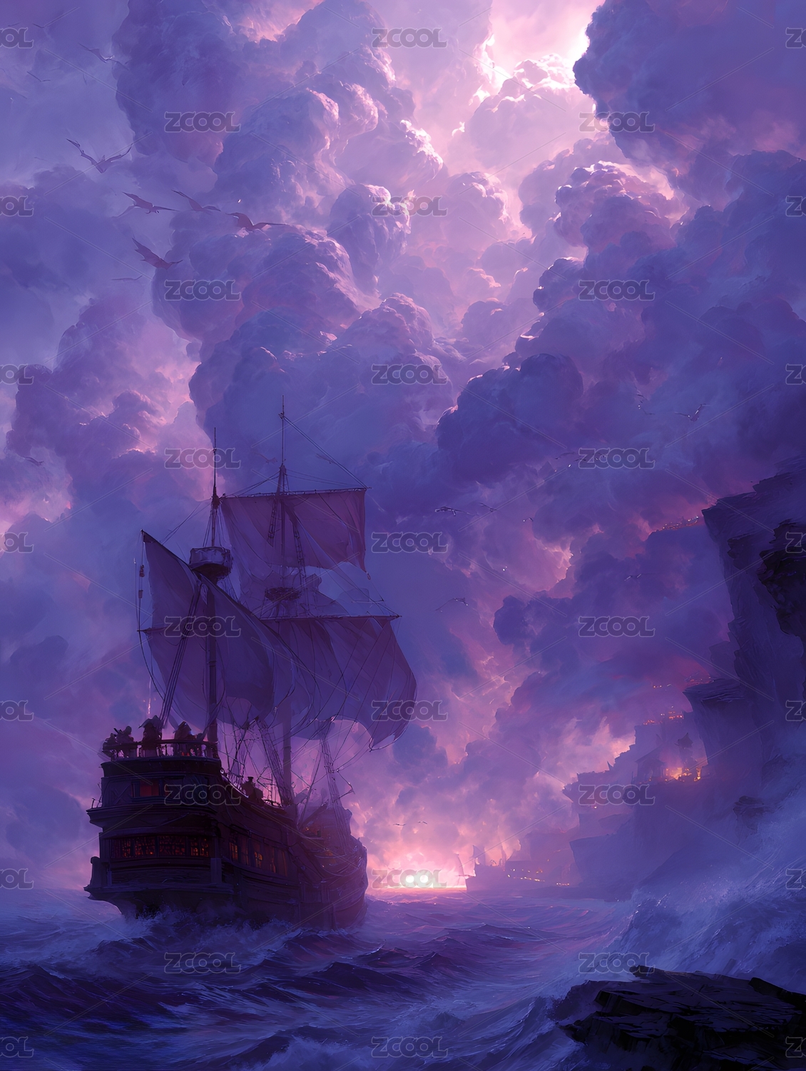 风暴之海中的帆船 壮丽紫霞