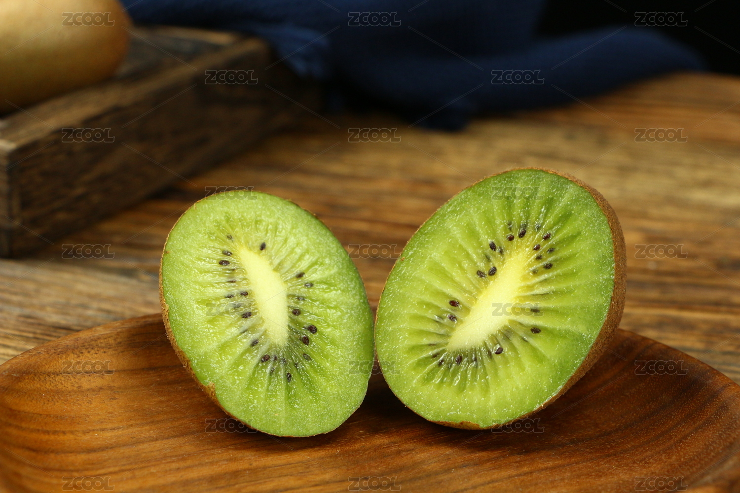 放在木纹背景小木墩上切开的新鲜猕猴桃