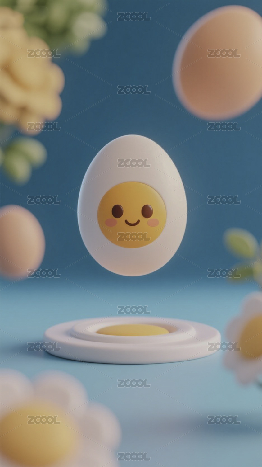 可爱风格的3D动画煎蛋在装饰花朵点缀