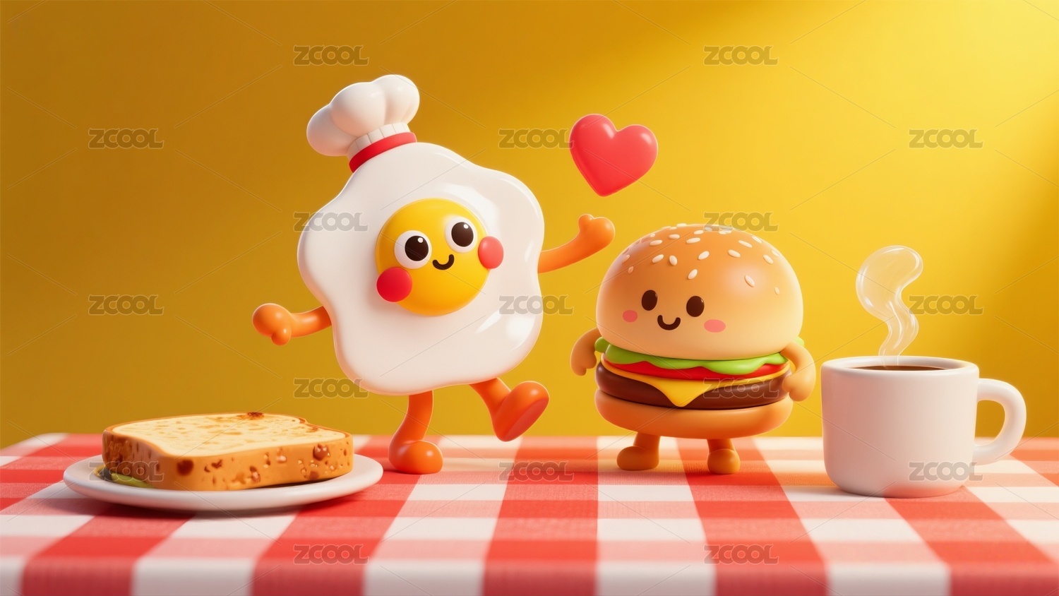 欧式美式快餐煎蛋鸡蛋蛋包饭3D卡通插画