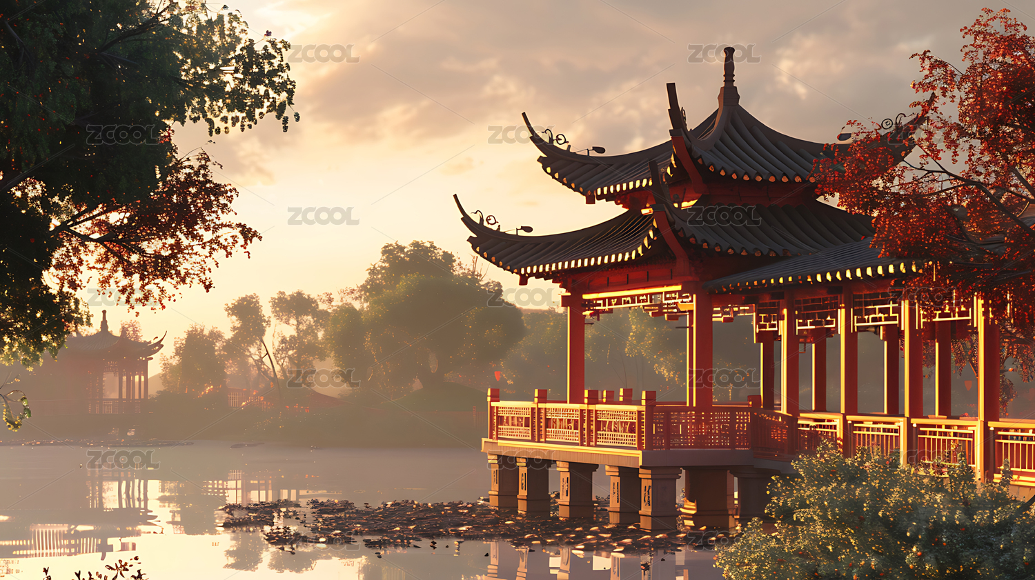 湖畔凉亭静谧山水意境
