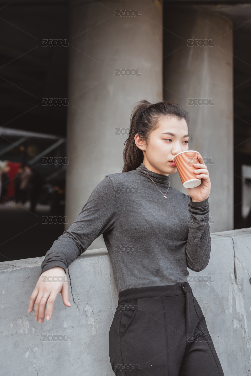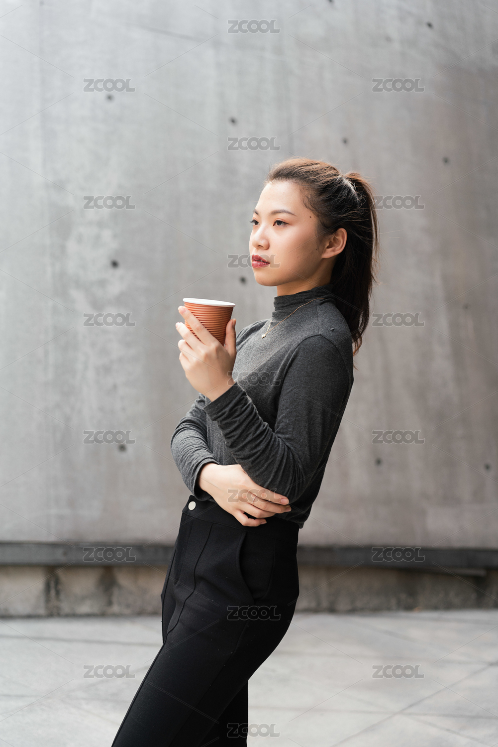 年轻亚洲商务人士捧着纸杯靠在半墙