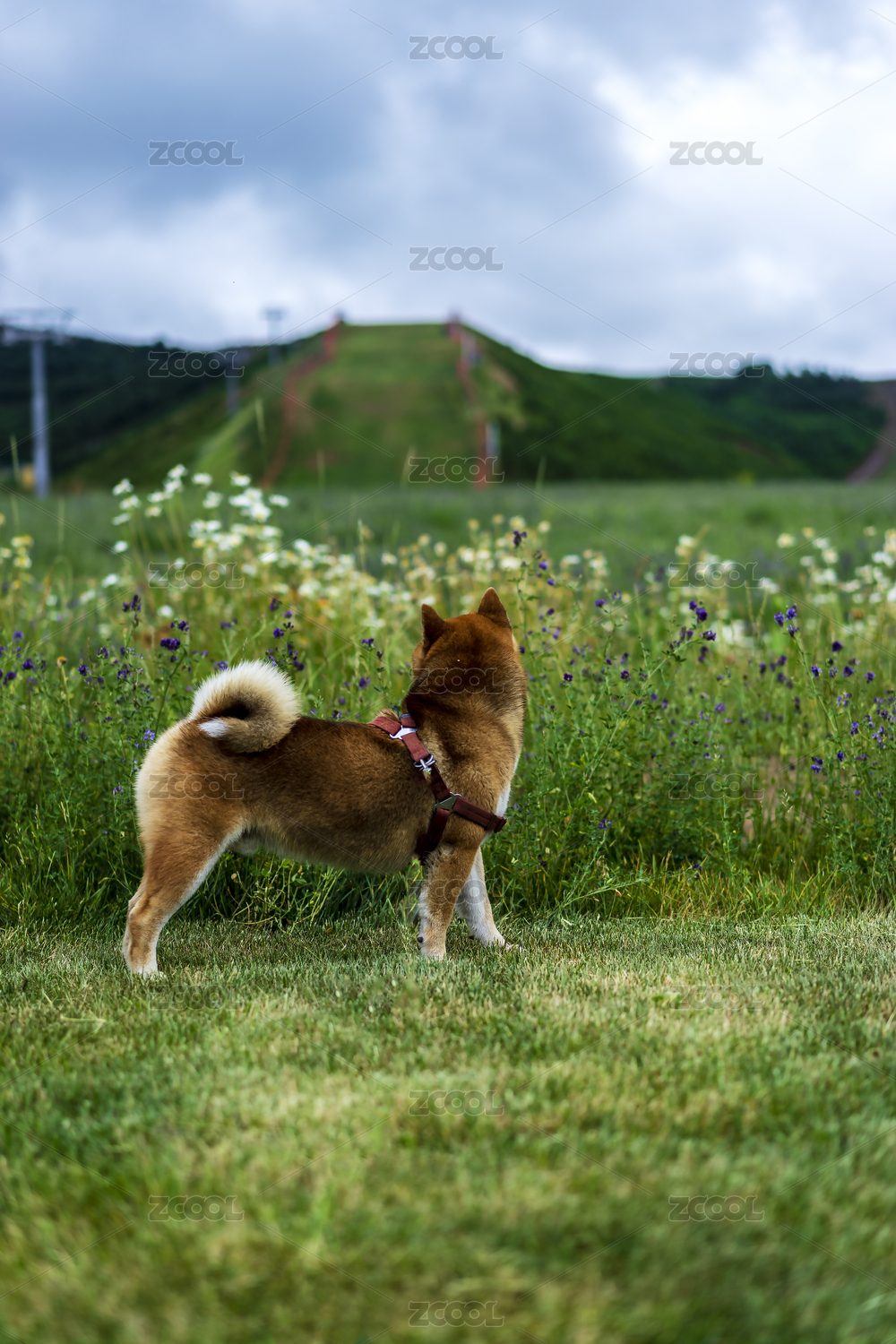 站在野花和草场的一只宠物柴犬背影