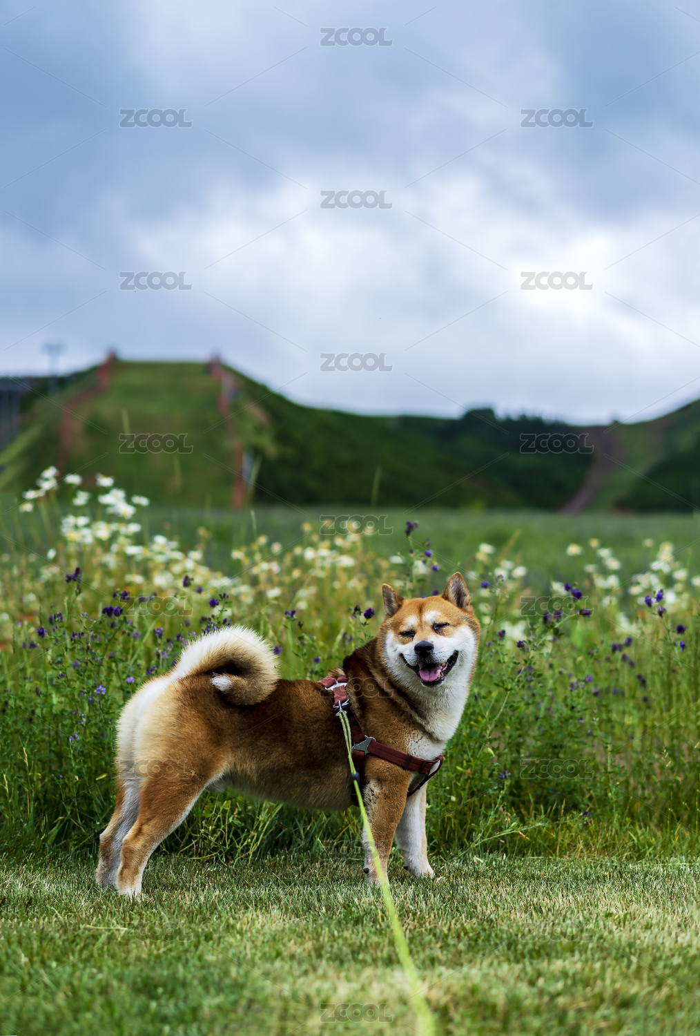 一只,宠物,狗,柴犬,野花,草场,笑,伸舌头,舌头,咧嘴