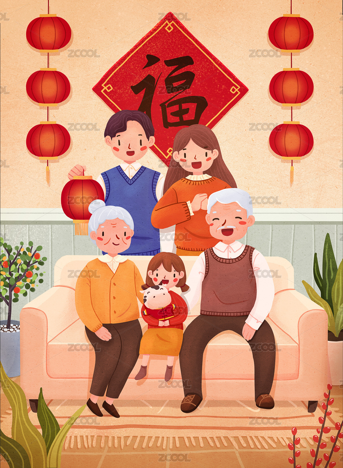 春节元宵节全家福拜年正月灯笼花灯矢量插画