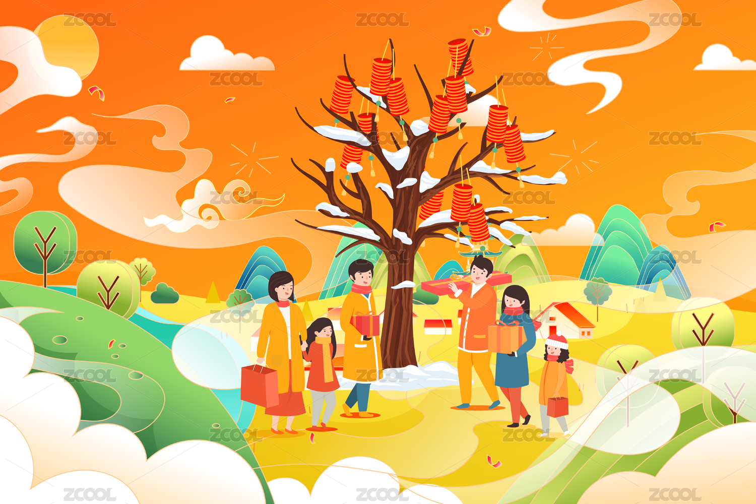 新春龙年过年人物传统喜庆矢量插画素材背景