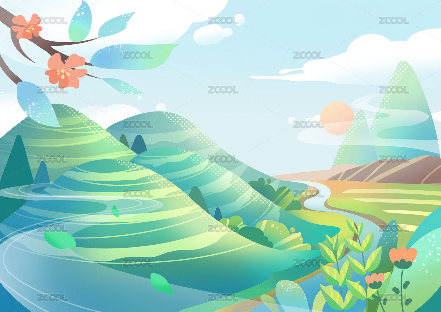 夏季自然风景矢量插画