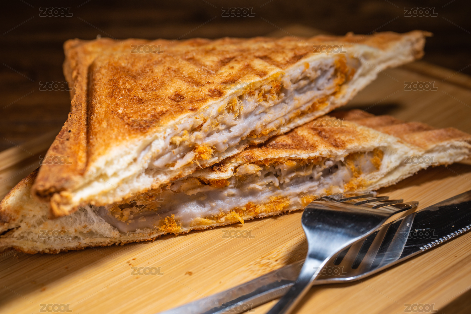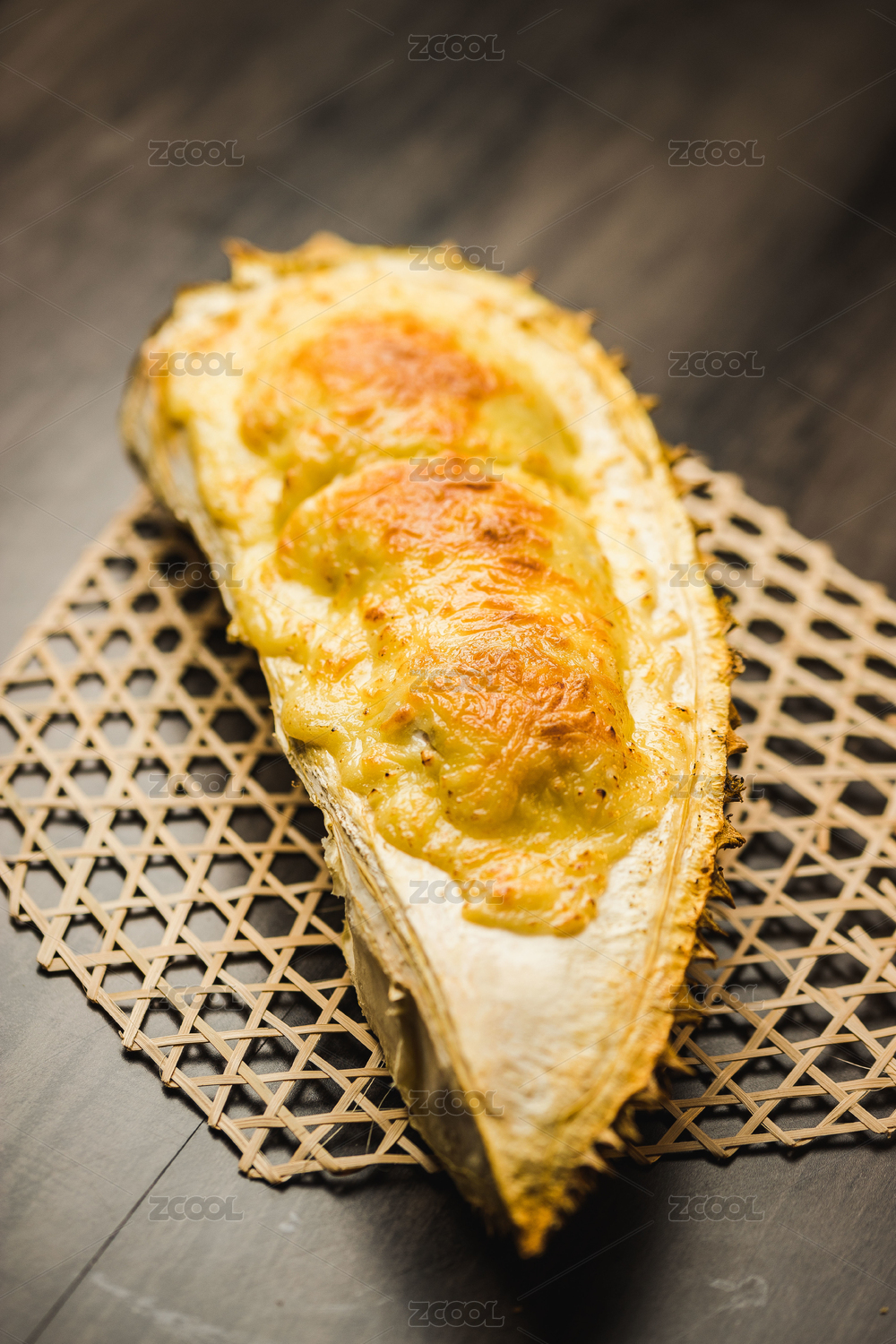 暗色木纹桌面上放着一份马苏里拉芝士焗榴莲