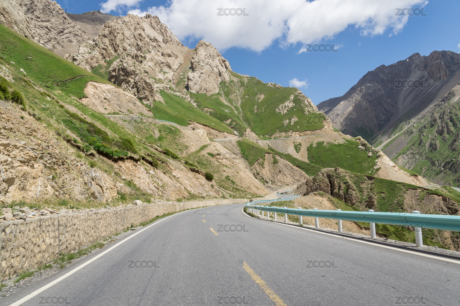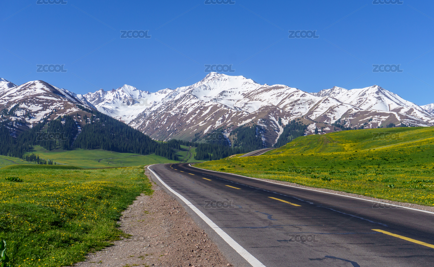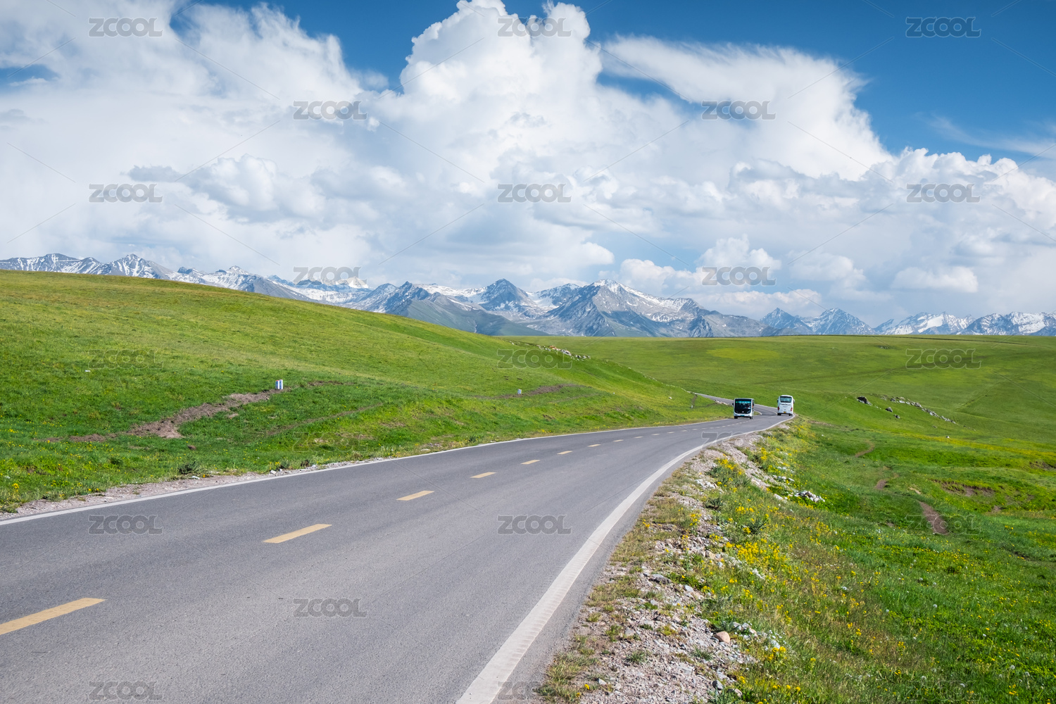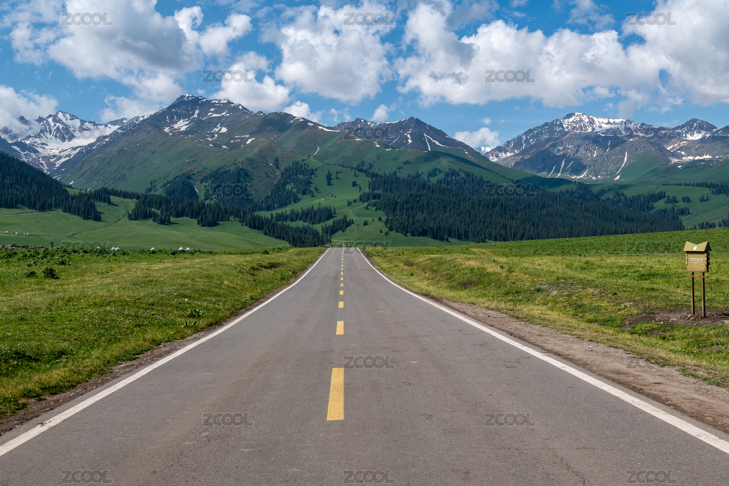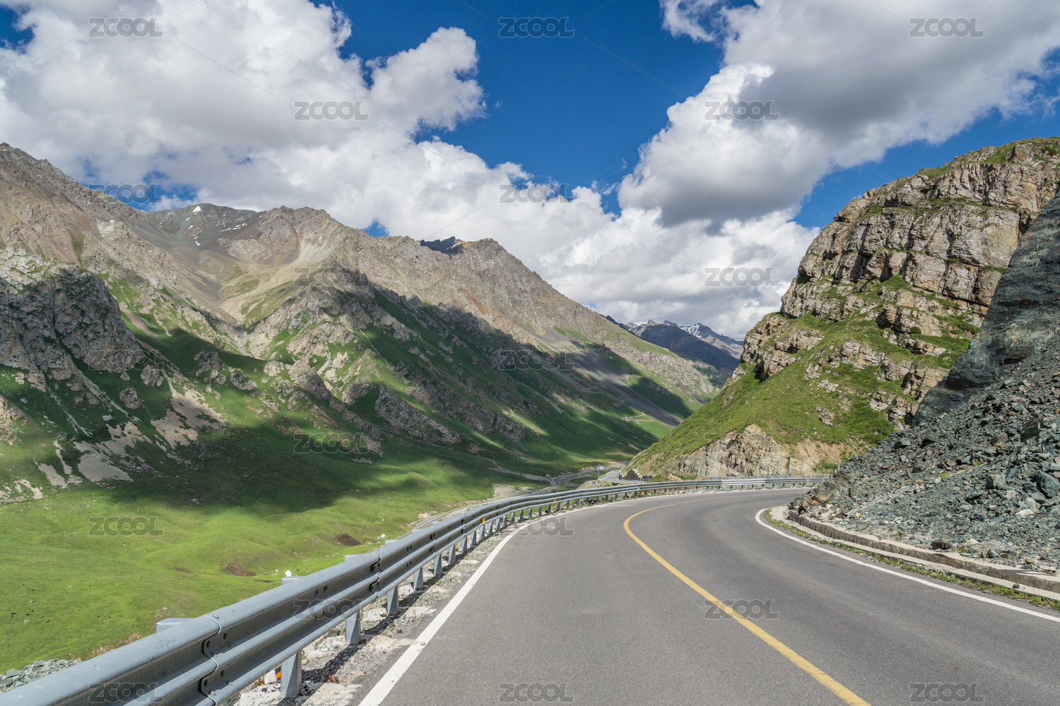 中国新疆夏季蓝天白云下G217独库公路沿途高山草原