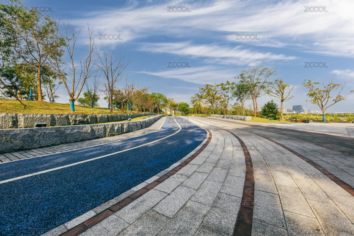 深圳人才公园蓝色跑道和地砖路面