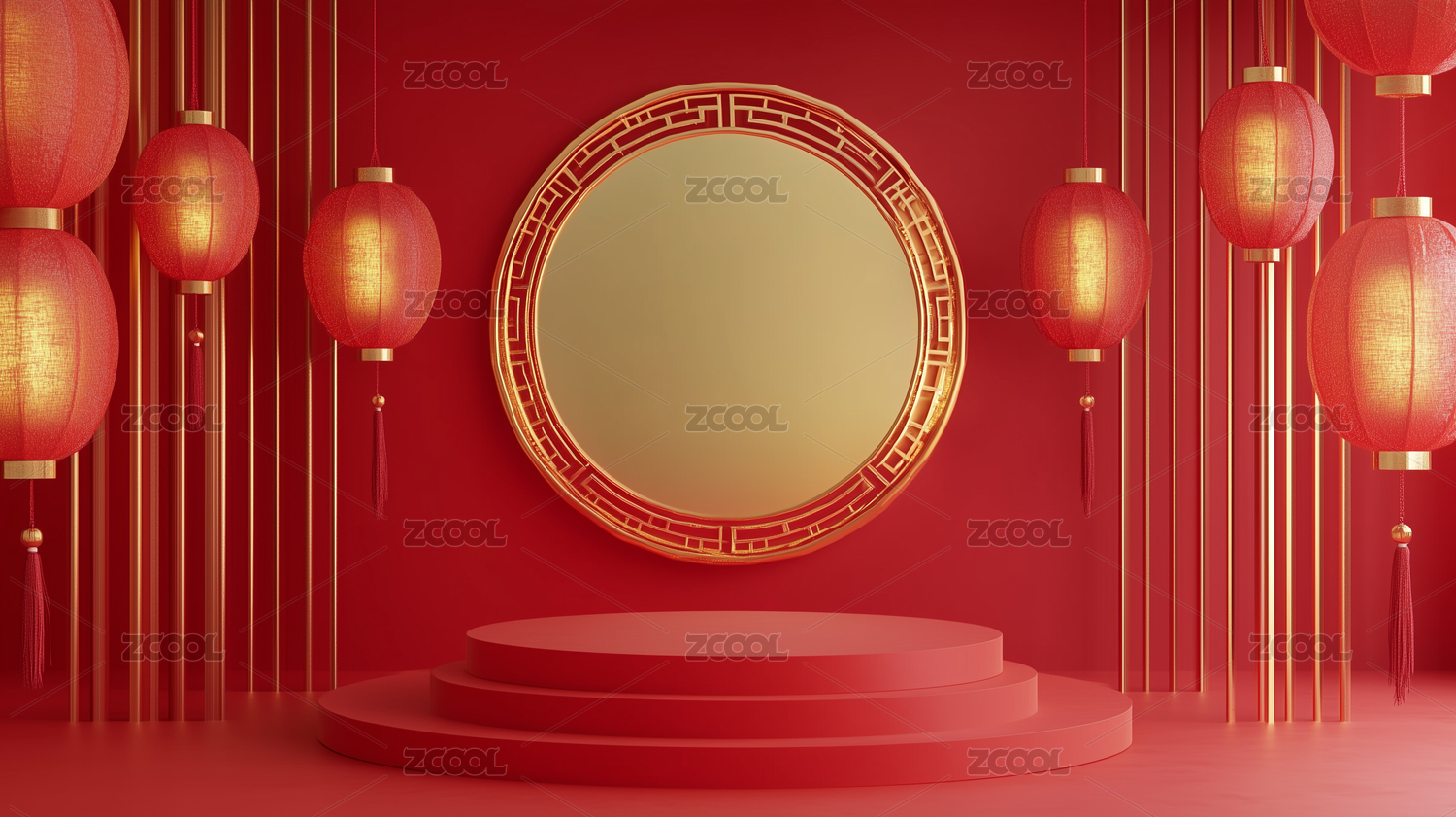 红金色,国风,灯笼,红色,3D,展台,背景图