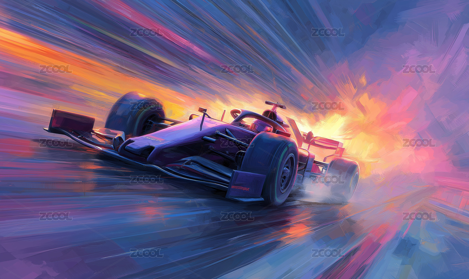 炫彩光影中火焰赛车疾驰的插画场景