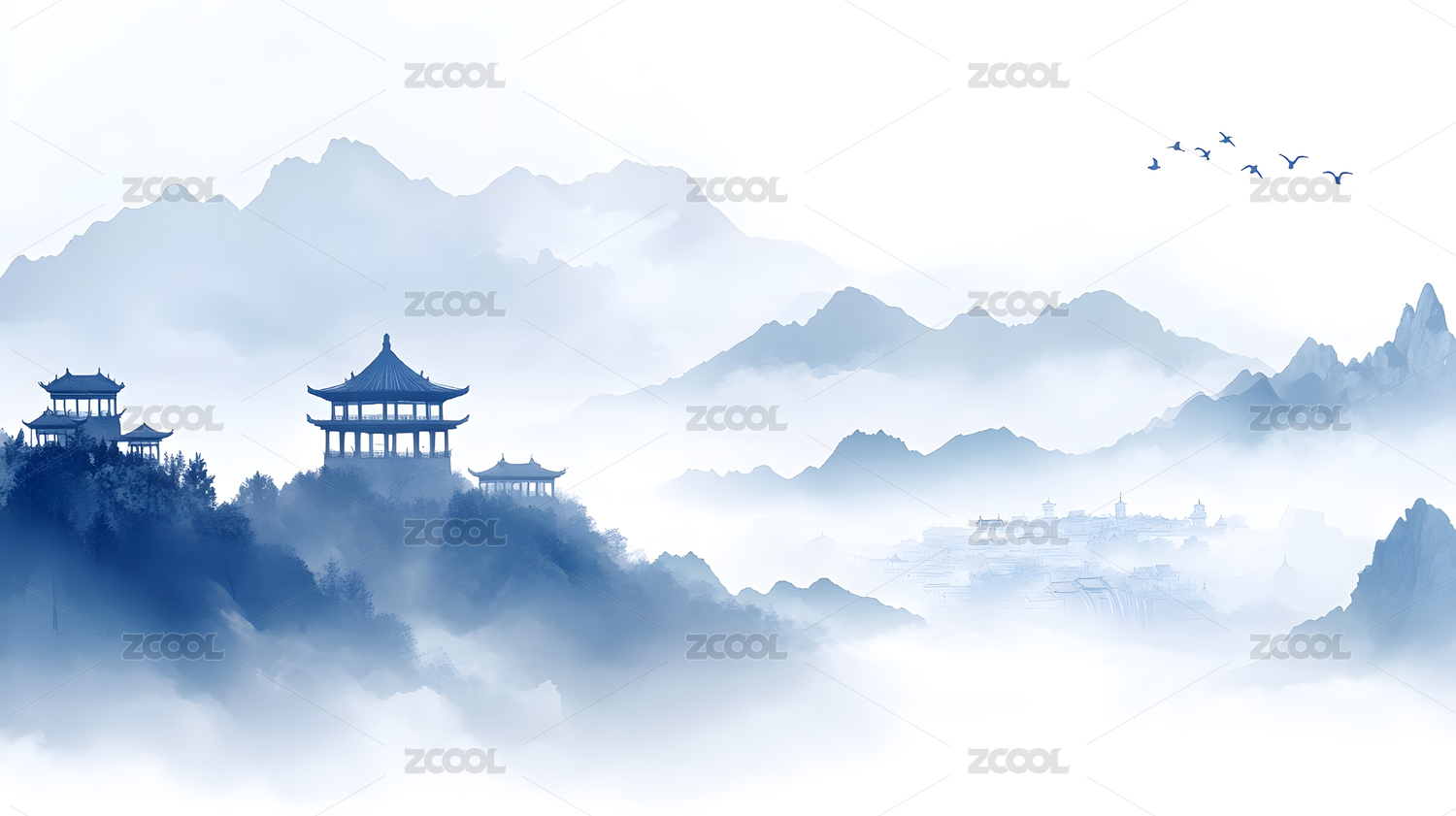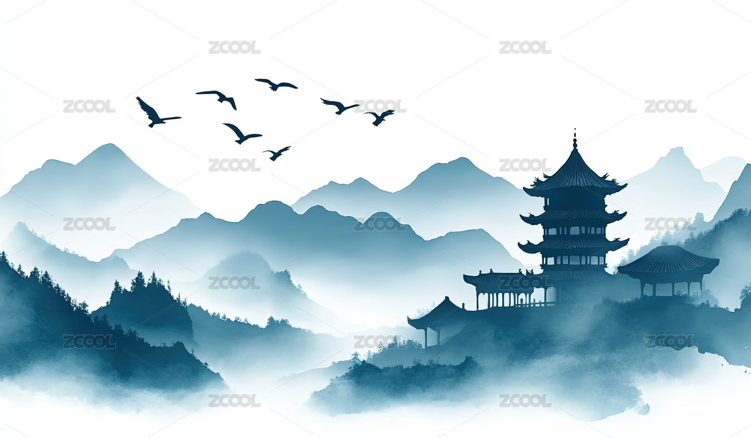 水墨山峦与寺庙