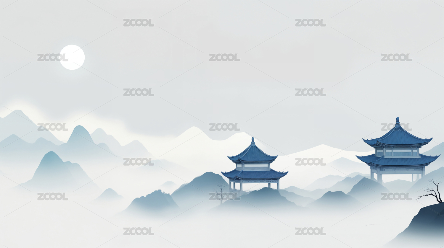 水墨山峦亭阁飞鸟红日