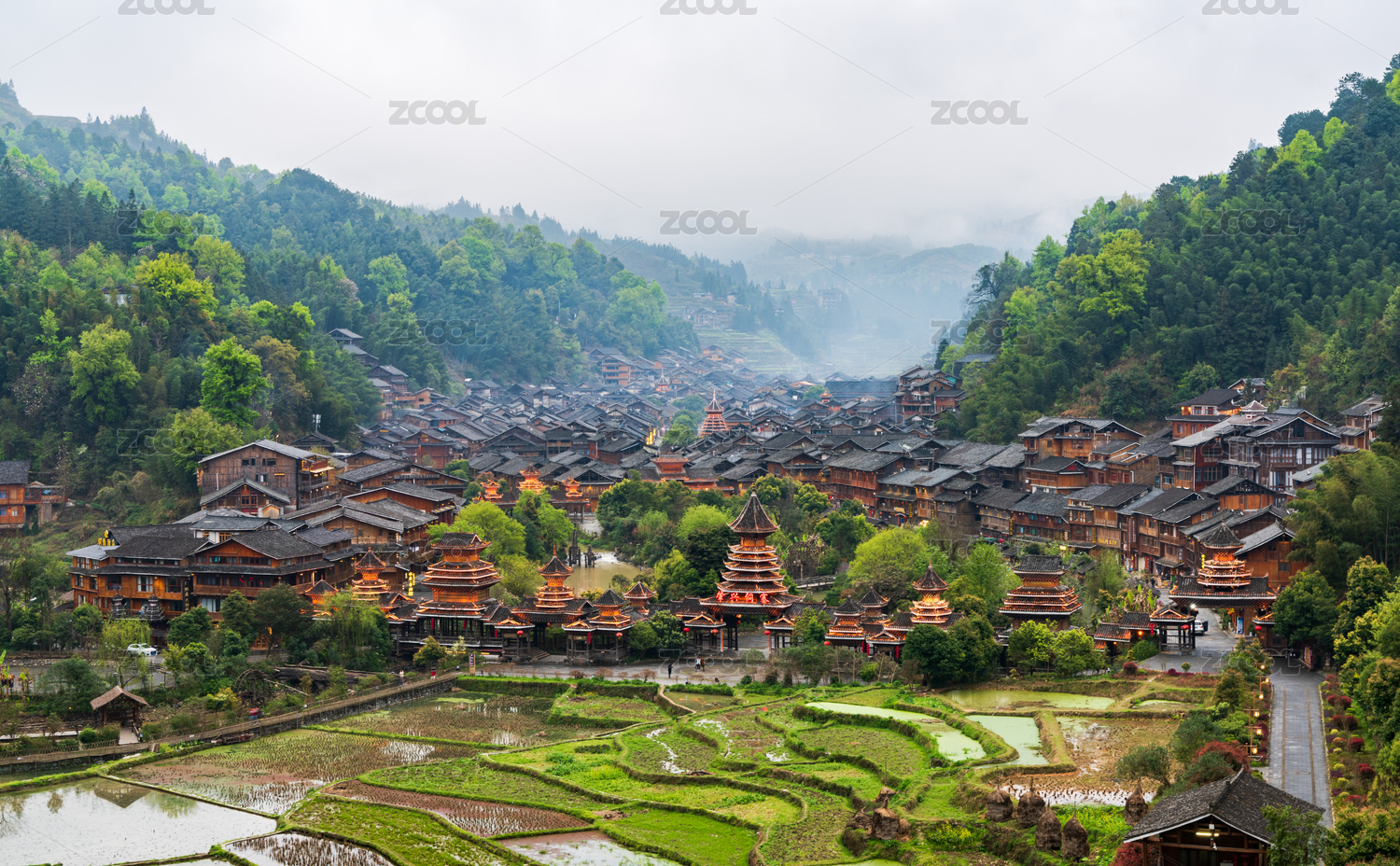 春季晨雾中的肇兴侗寨