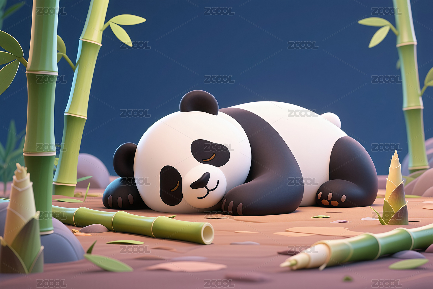一只躺地上抱着竹子睡觉的熊猫3D立体插画