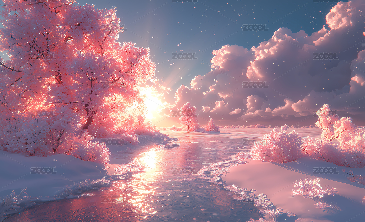 梦幻冬日粉色雪景,宁静水面倒映天空
