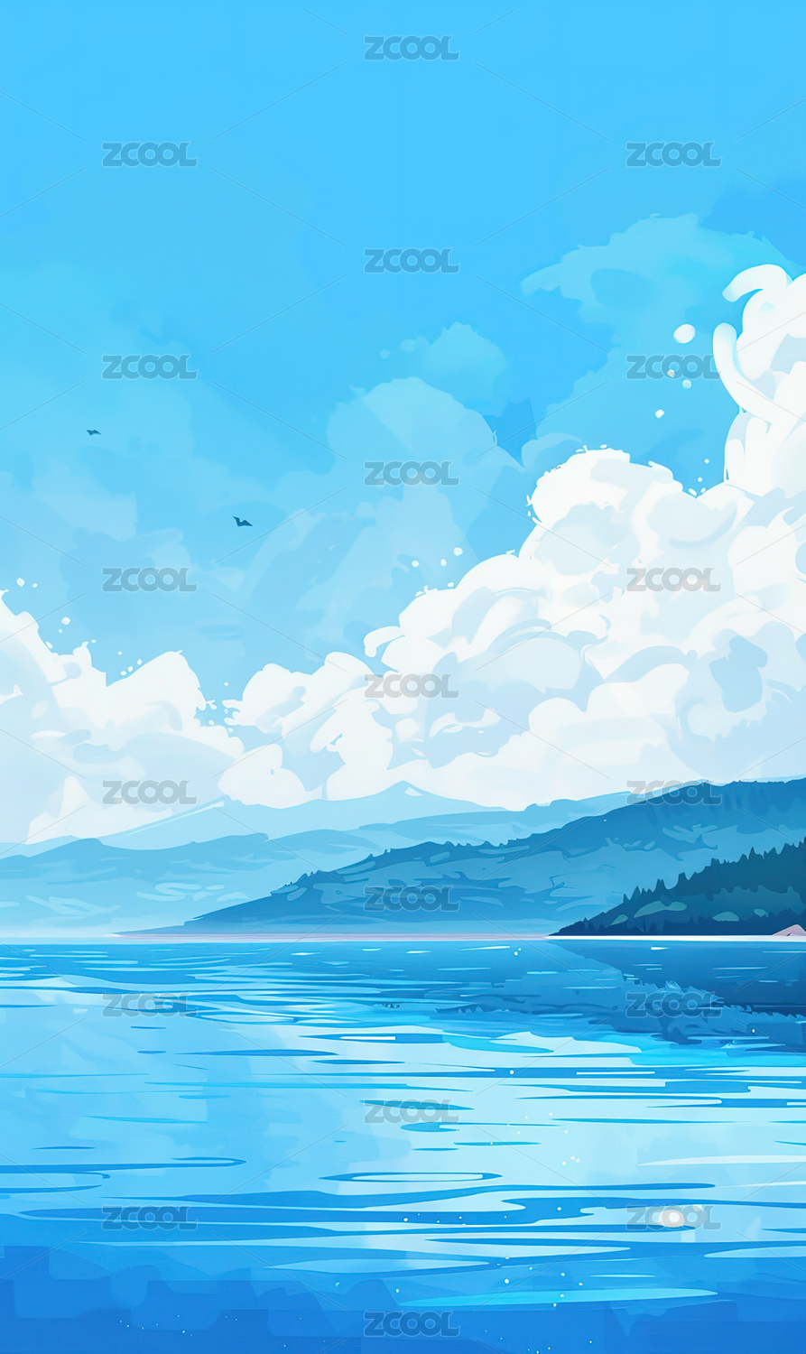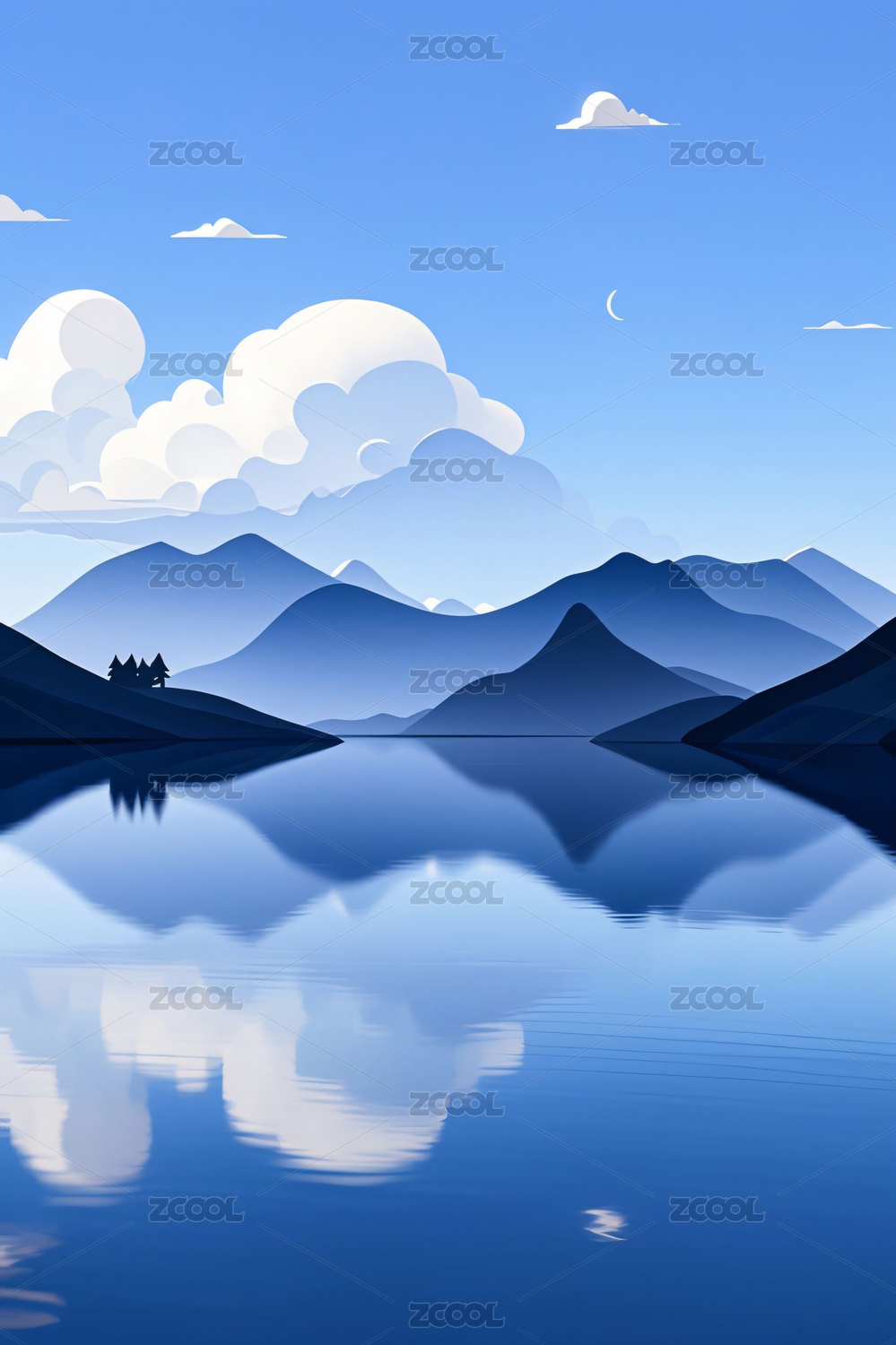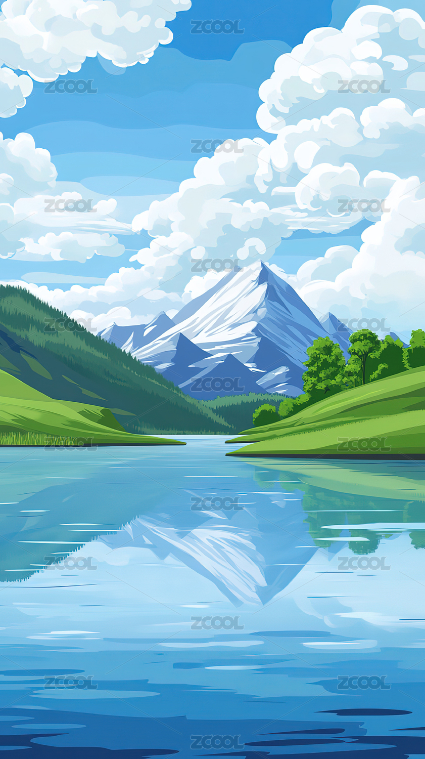 手绘卡通蓝色天空下的森林湖泊风景插画