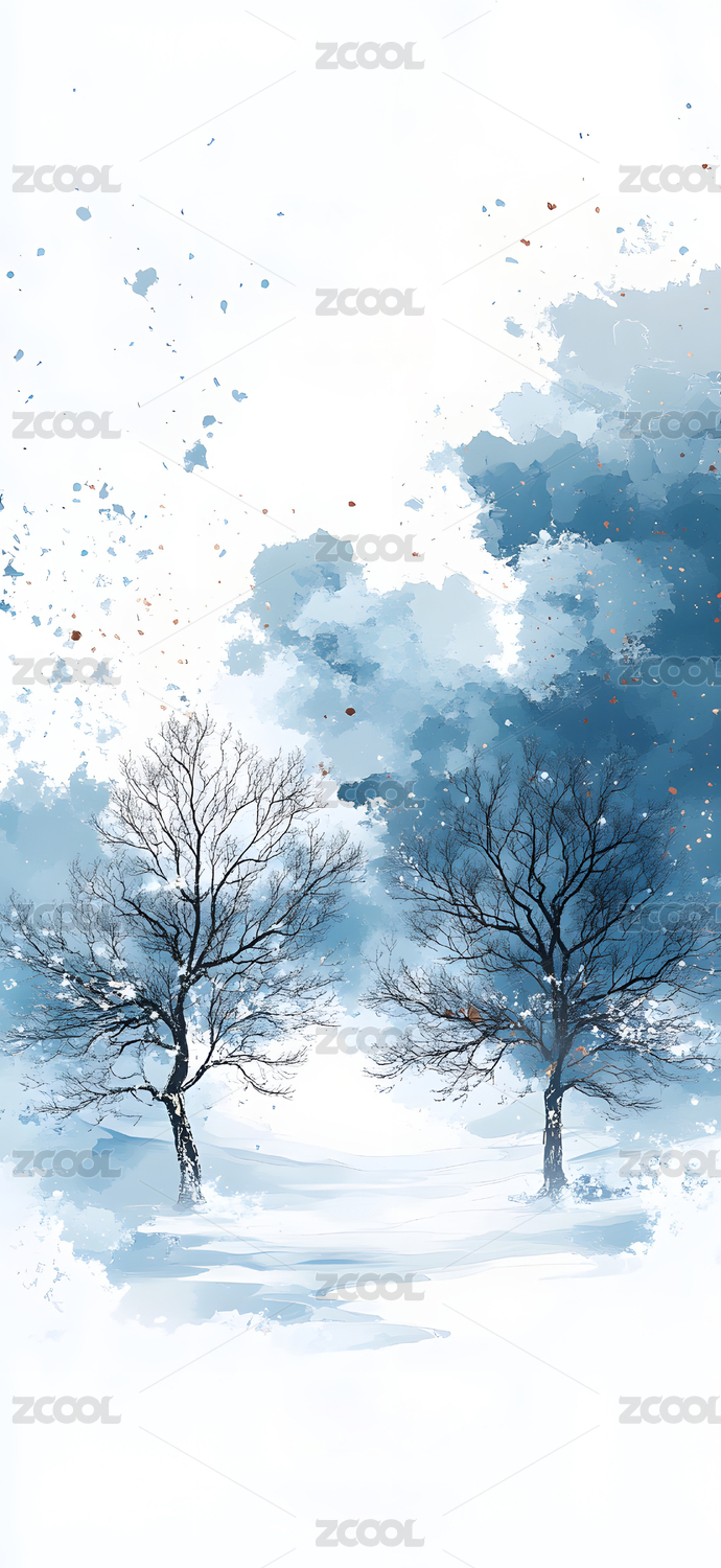 蓝色水墨冬季雪景中枯树与飞溅墨点插画