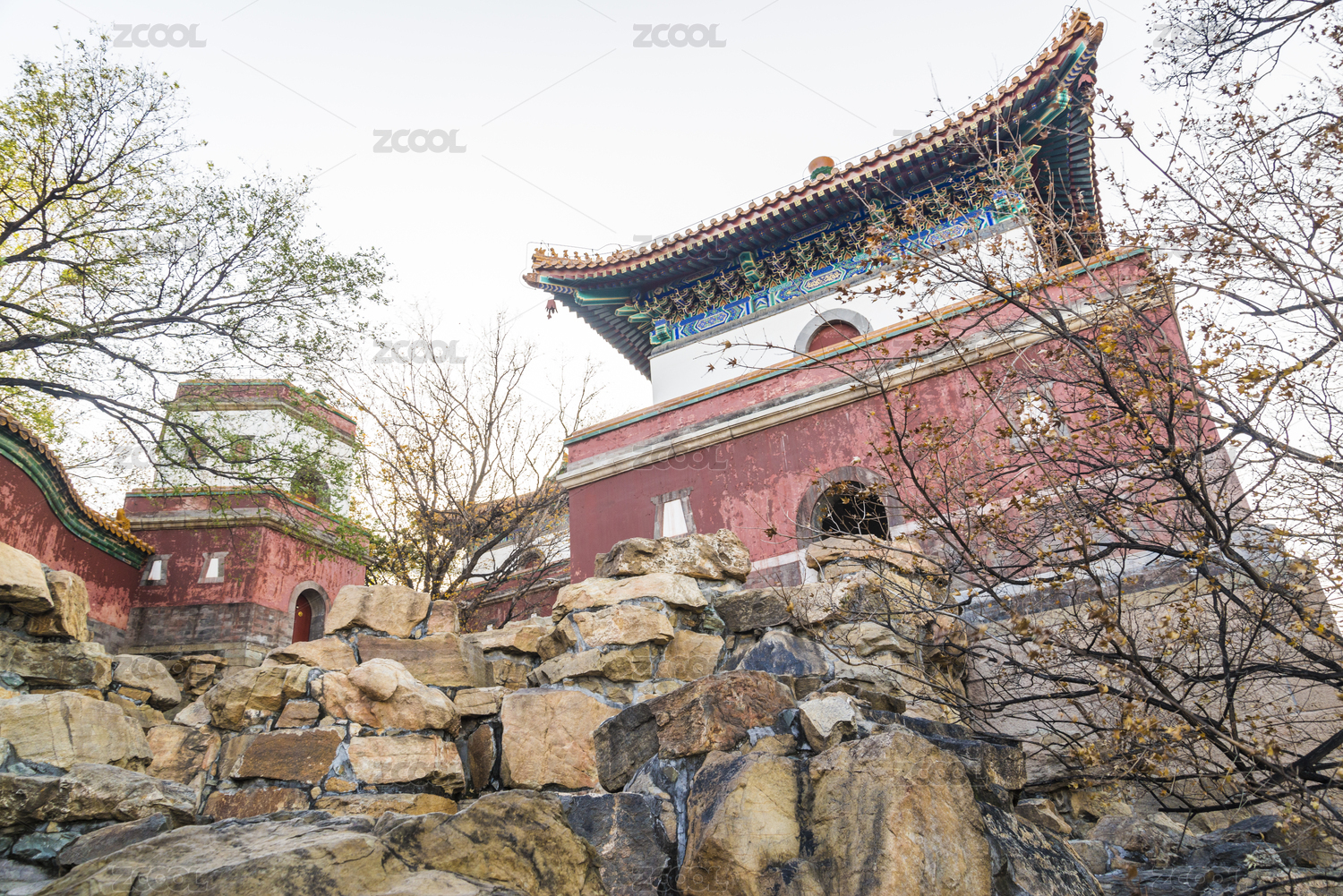 颐和园外八庙四大部洲竖幅蓝天阳光光晕红色蓝色庙宇庙堂秋天冬天秋冬塔尖