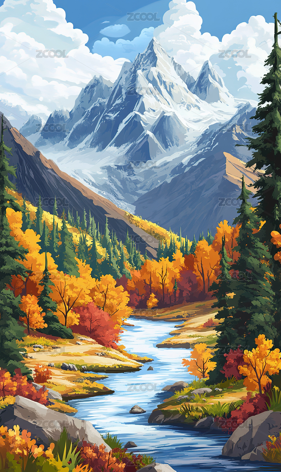 雪山溪流与松林