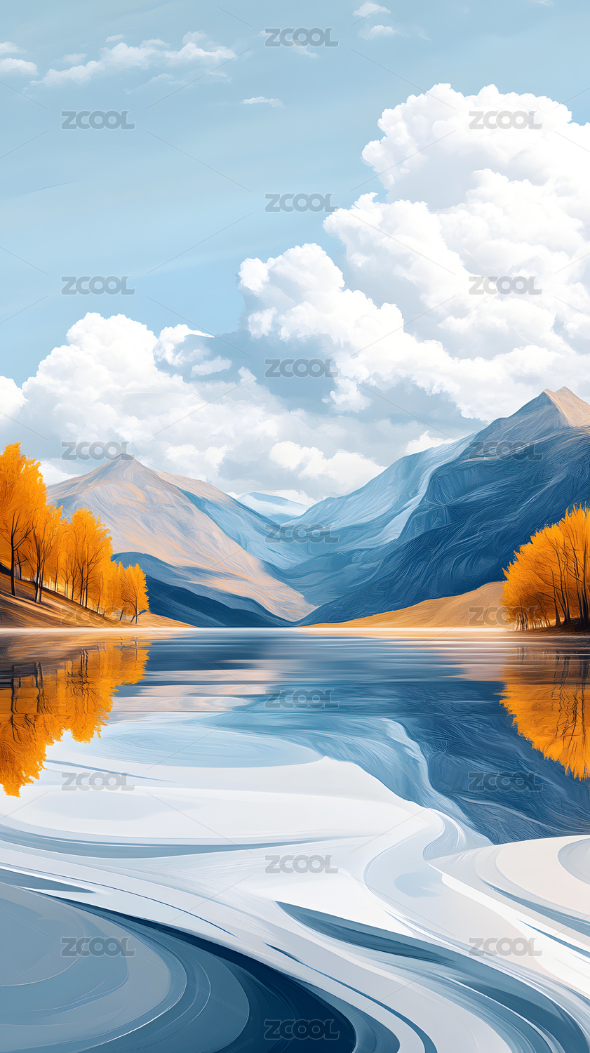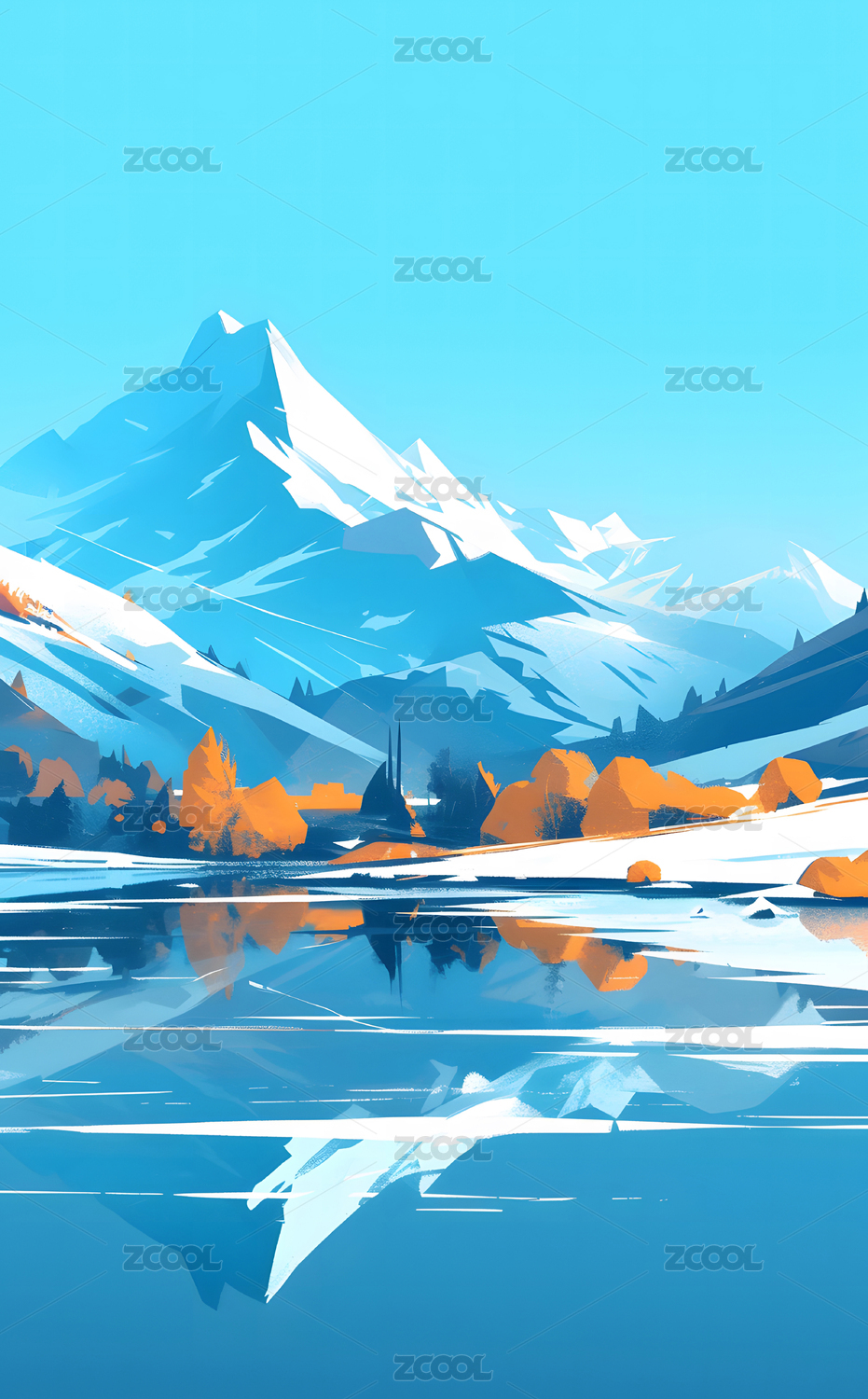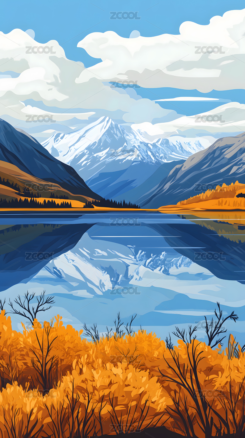 数码彩色雪山蓝天水面场景图形海报背景