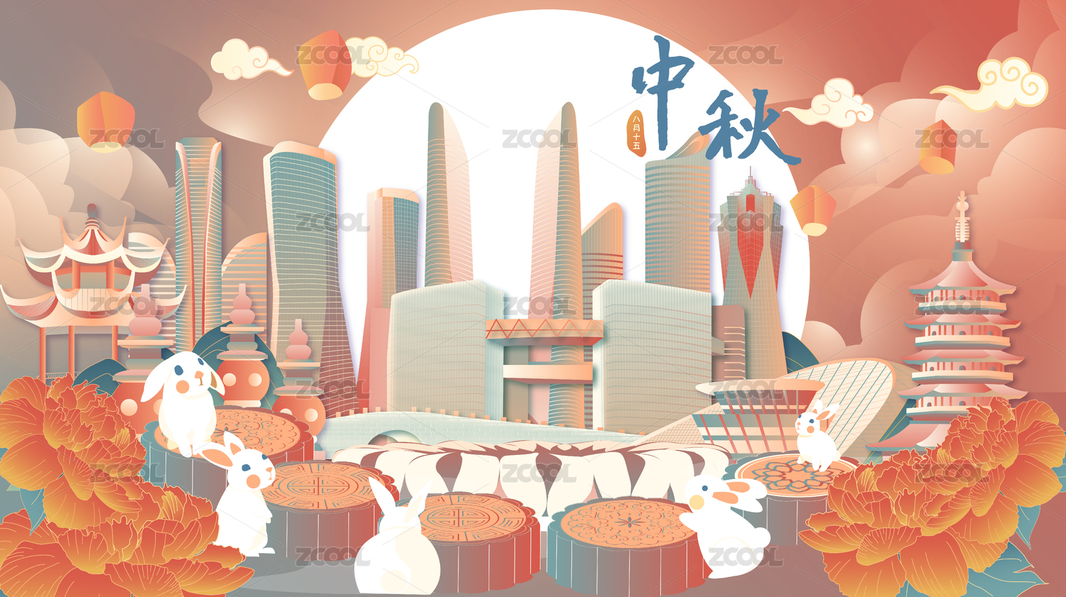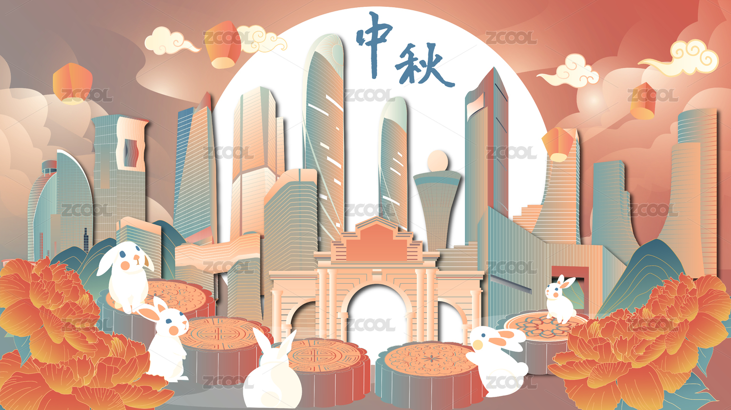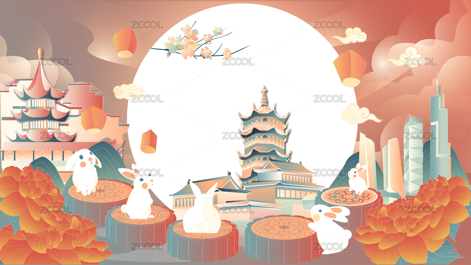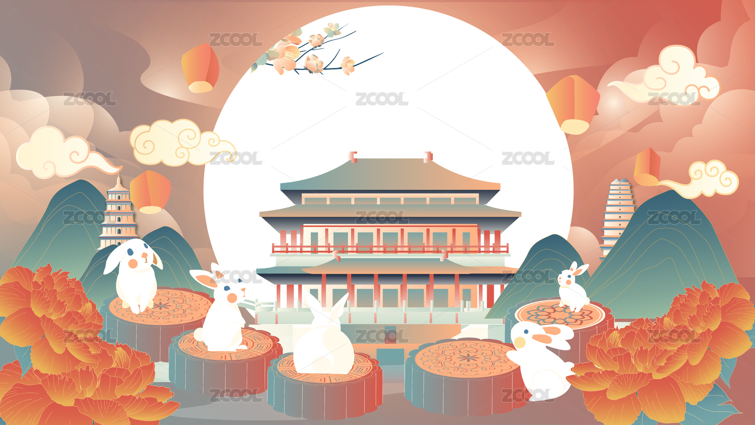 中秋节五只兔子站在月饼上看月亮矢量插画