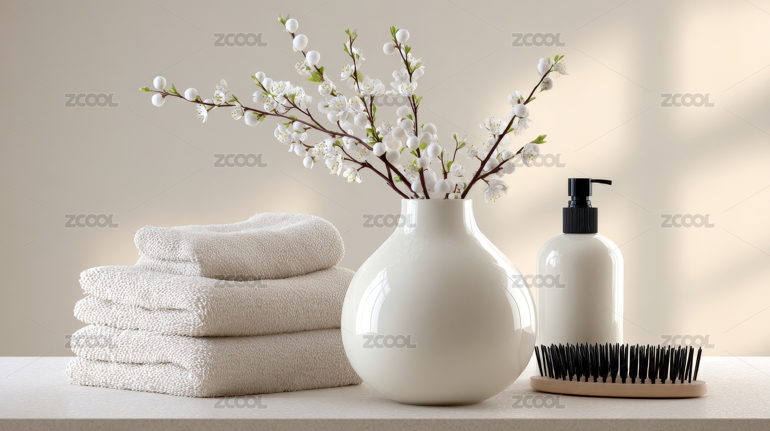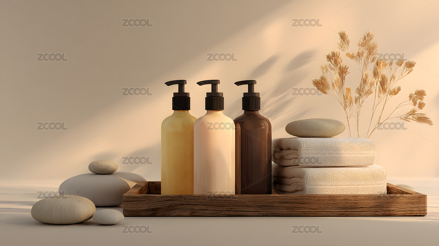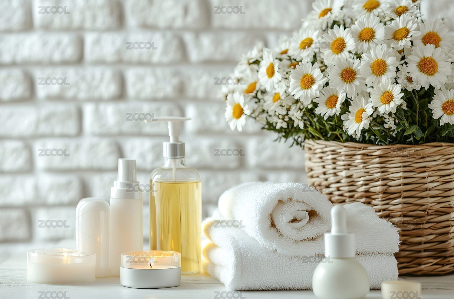 带有瓶罐毛巾的简约spa场景