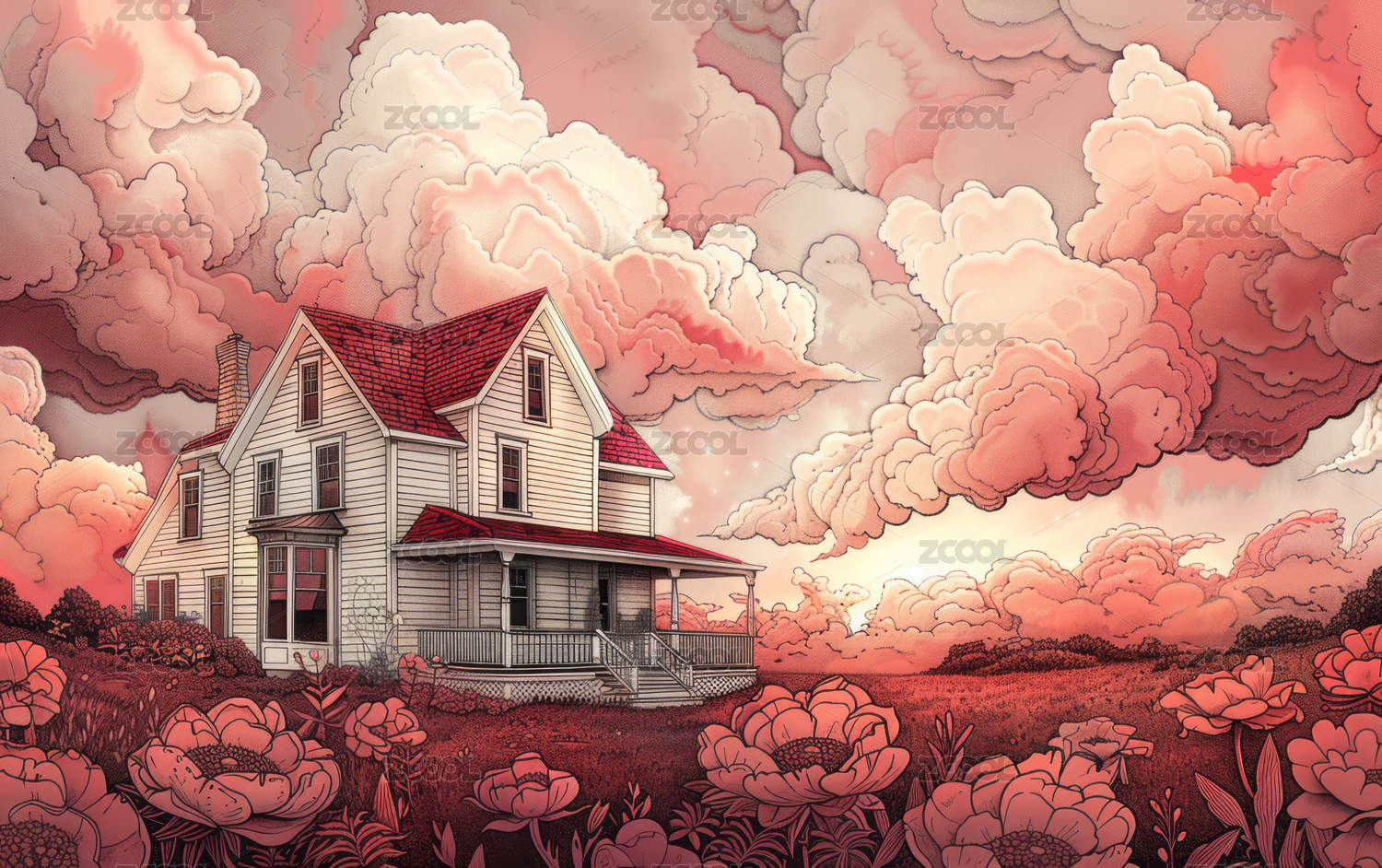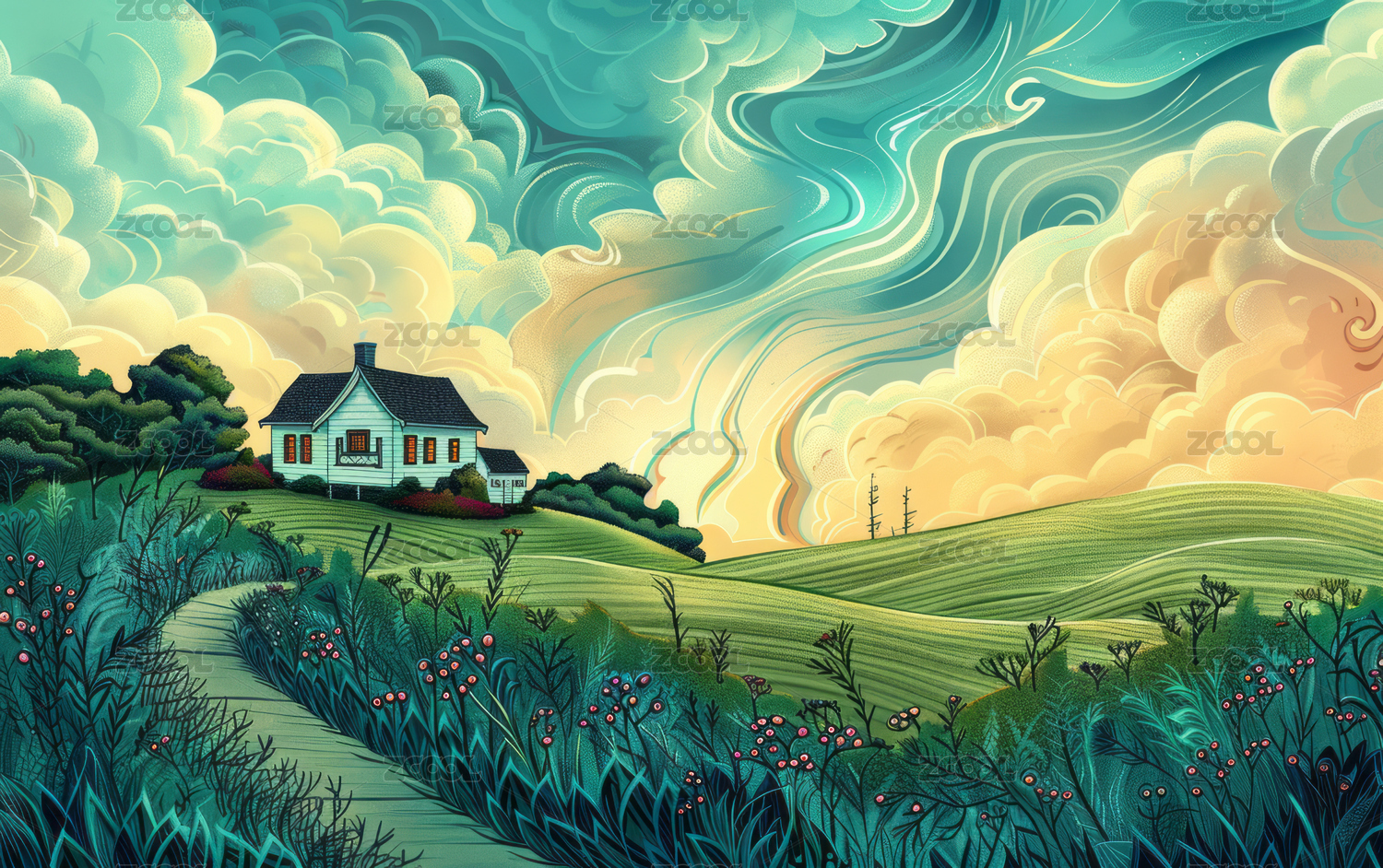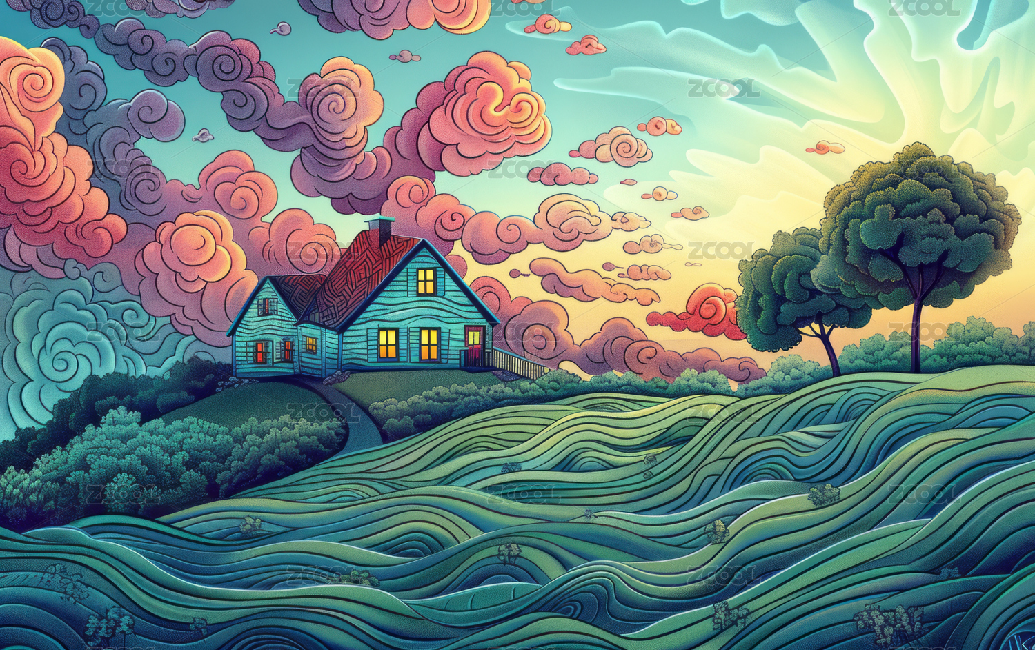 迷幻风格的欧美自然景观艺术插画