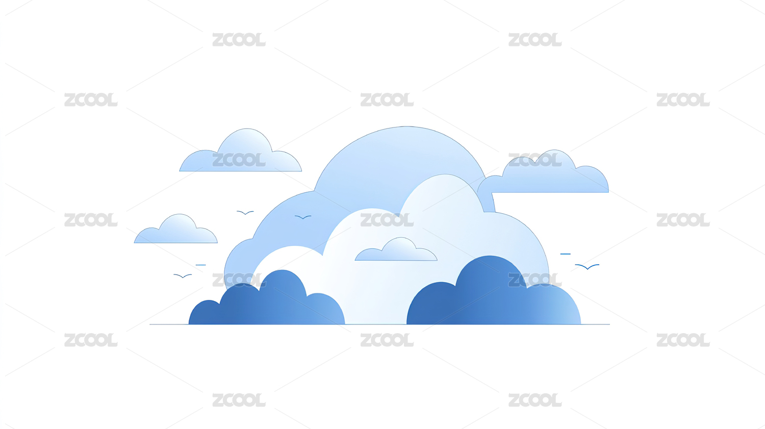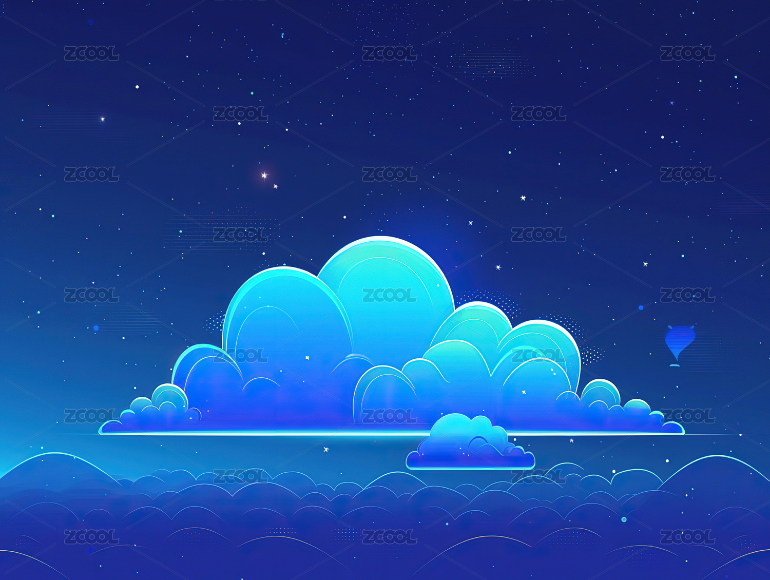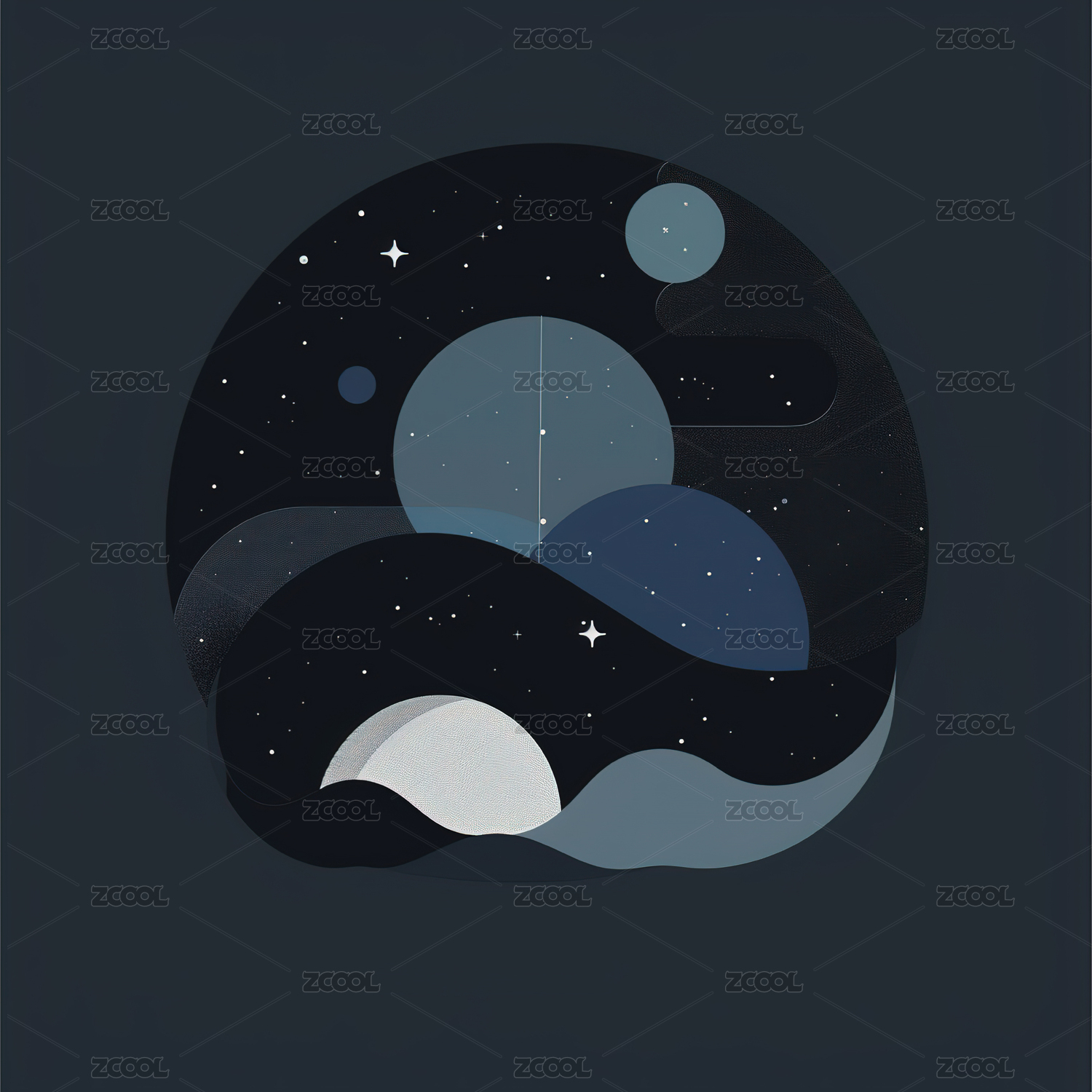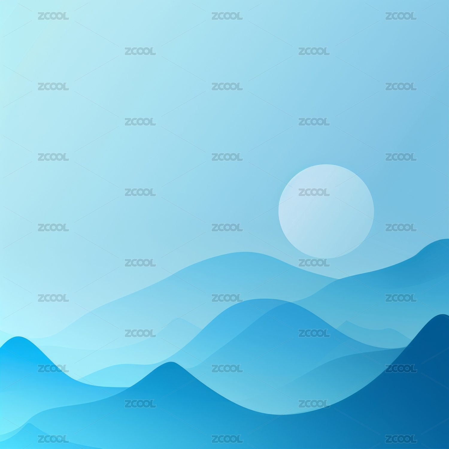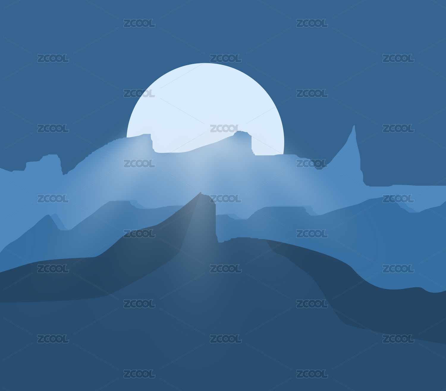 蓝色渐变圆形扁平夜晚圆月云朵山水倒影风景简约商务启动图手绘插画