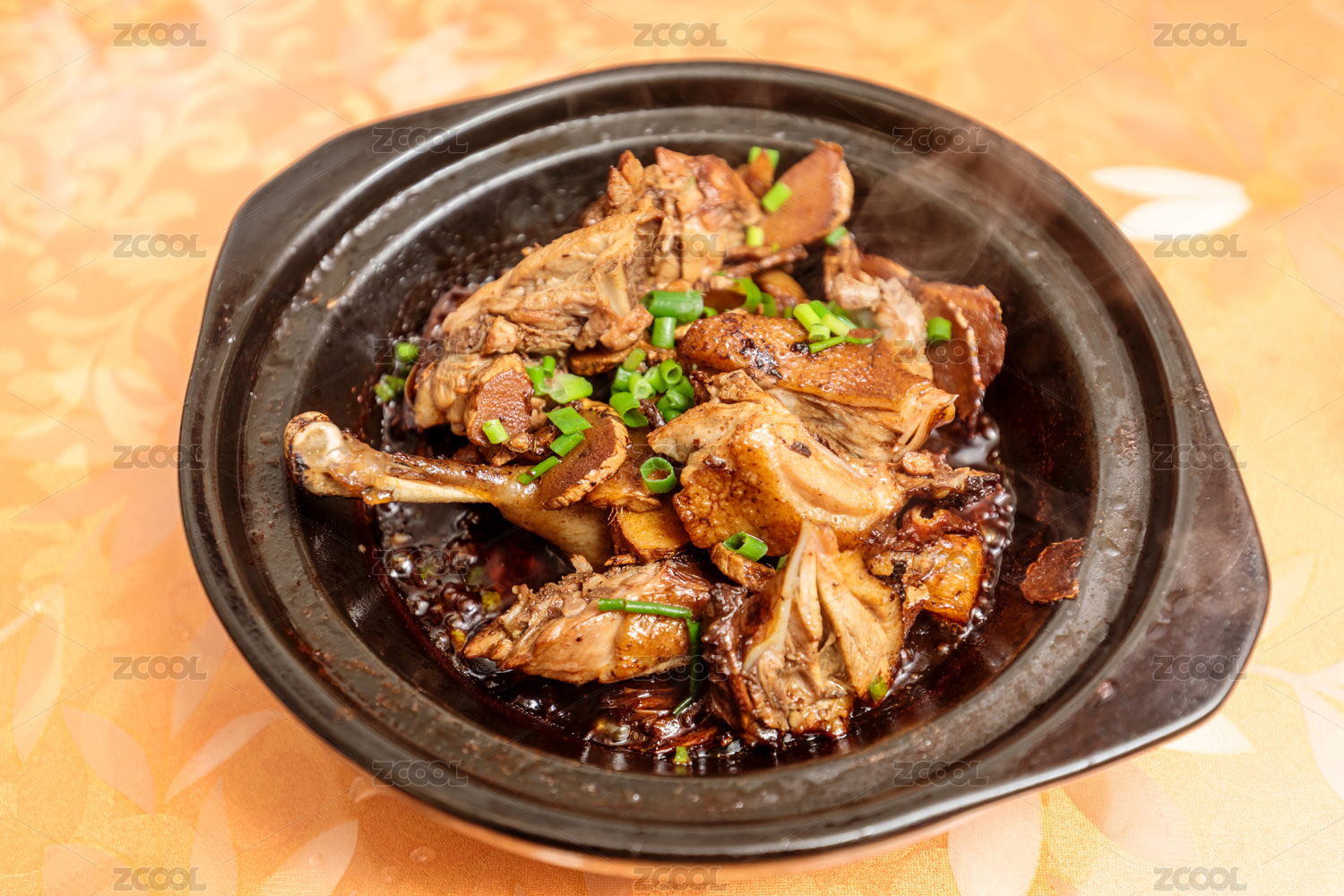 褐色砂锅装的香焖牛仔骨摆放在黑色鹅卵石上