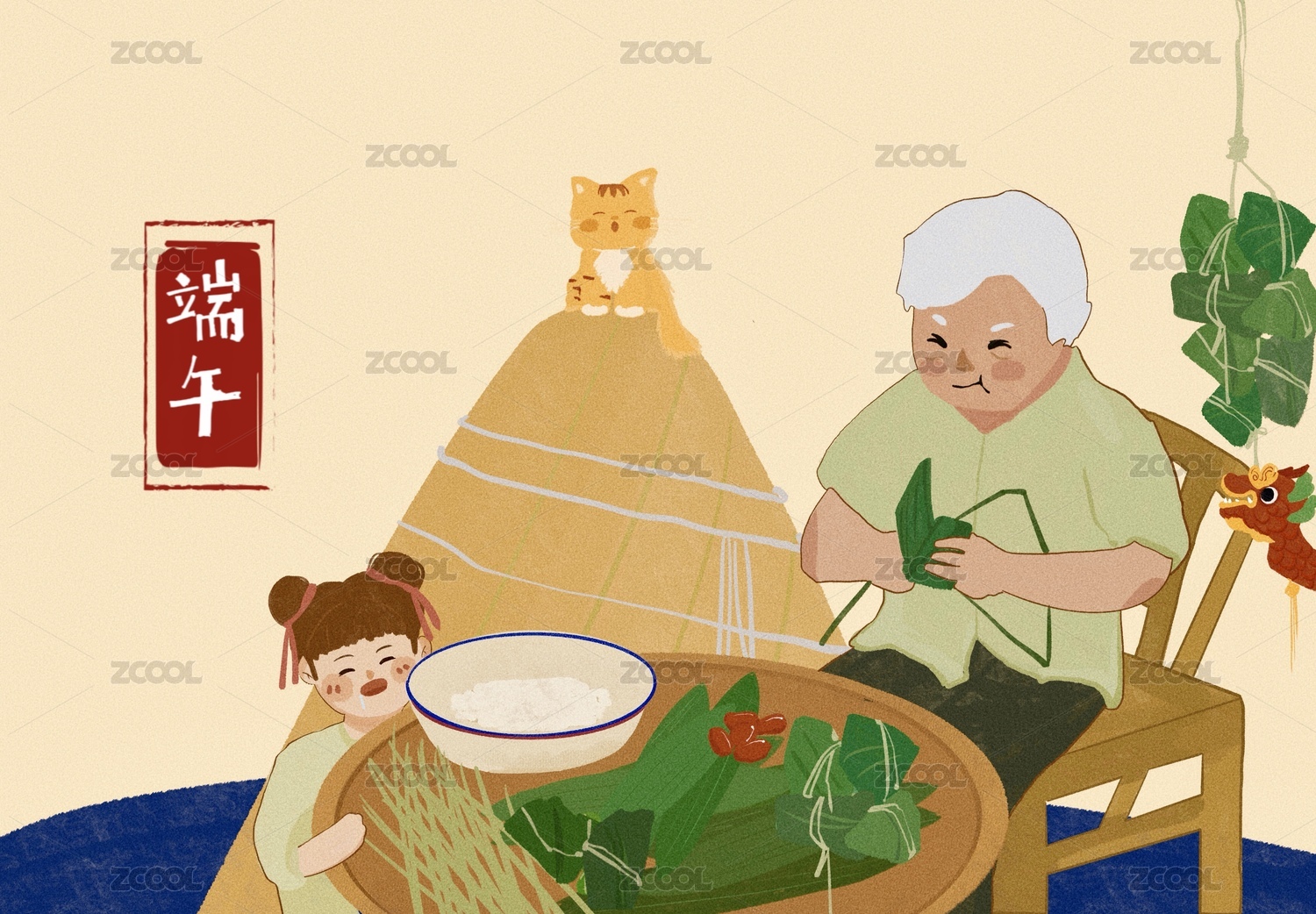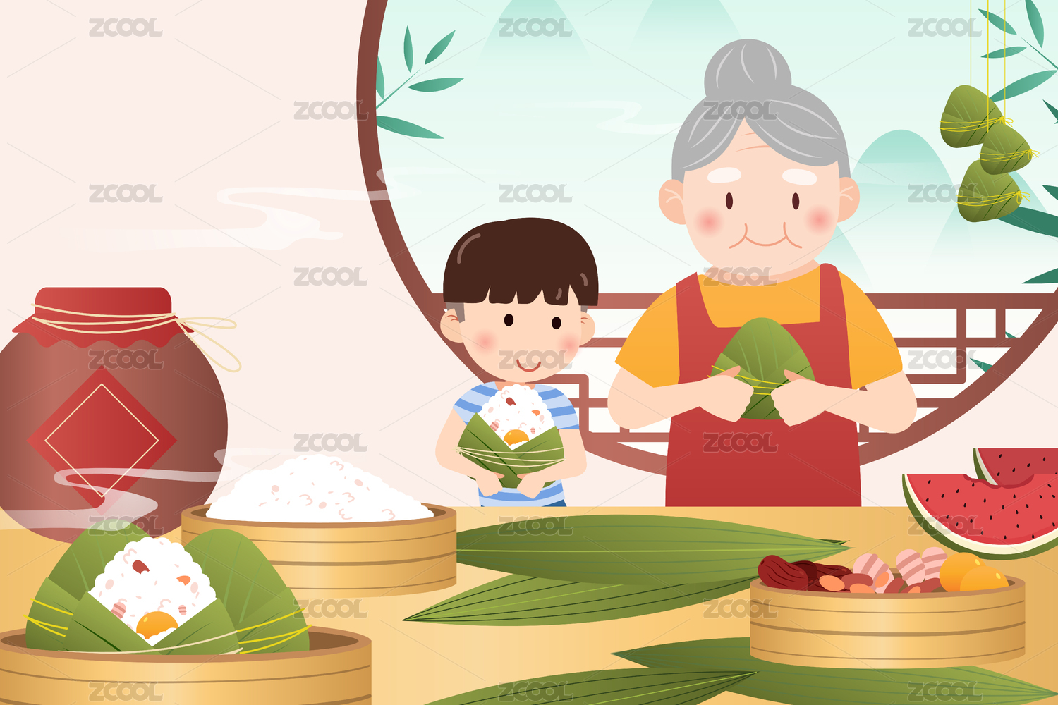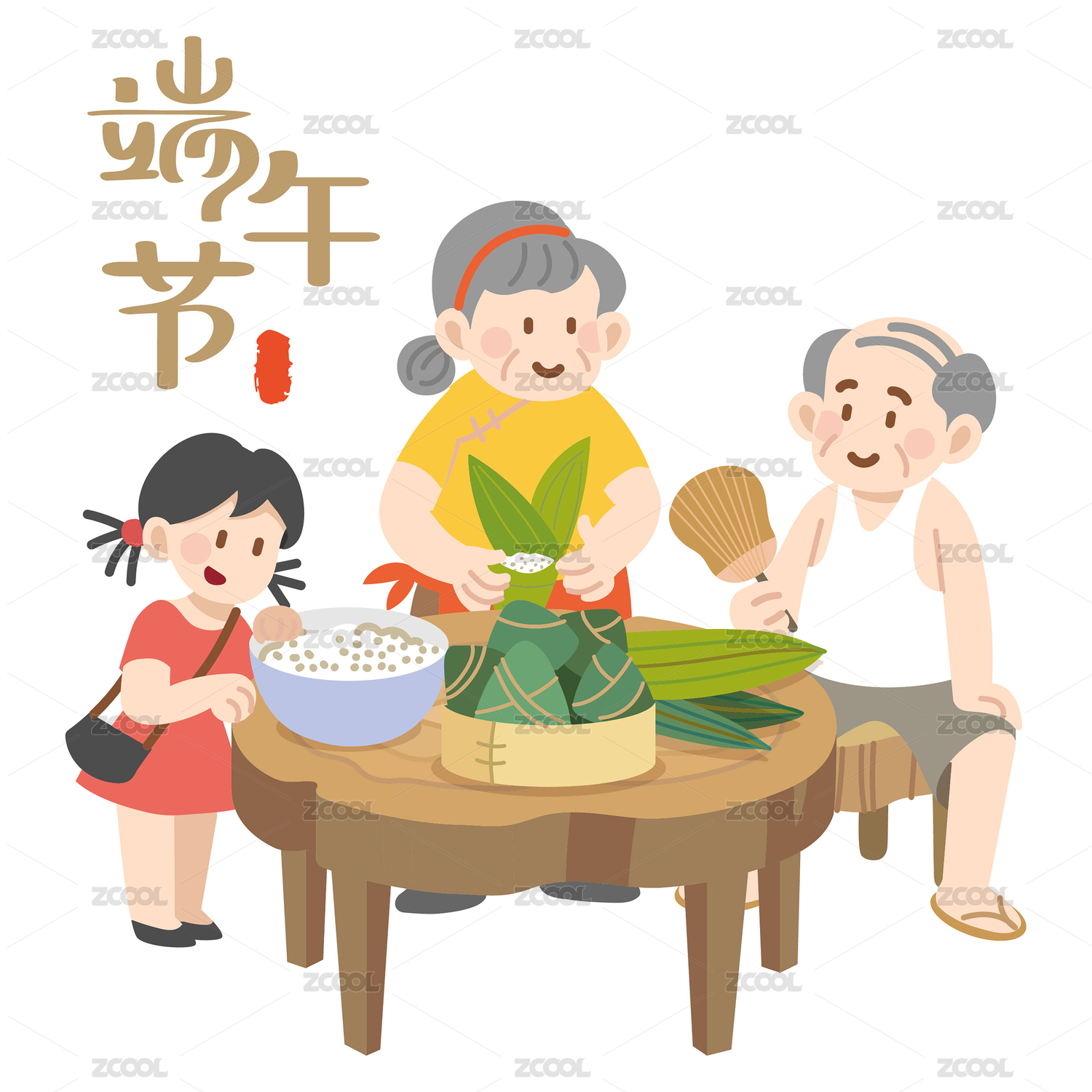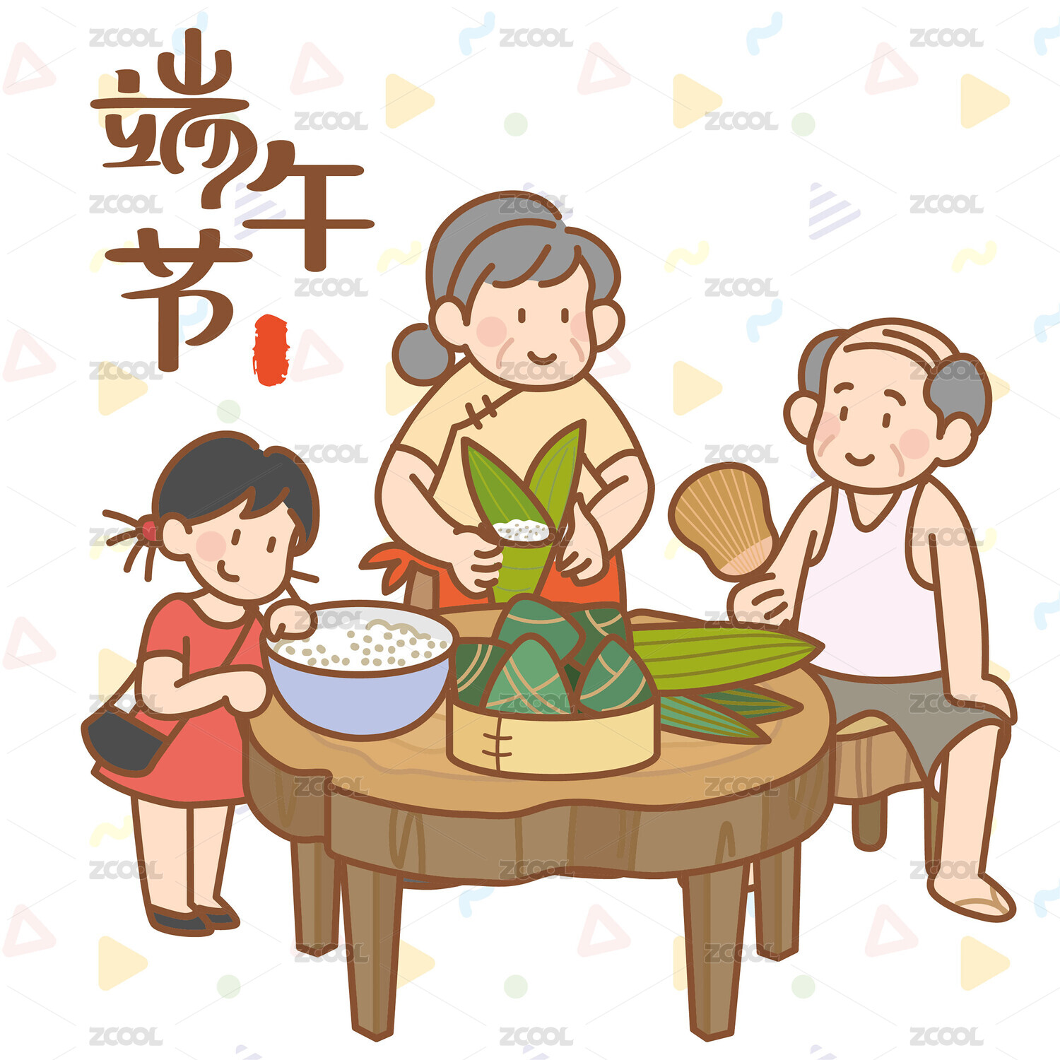 端午节传统节日插画无边:端午和爷爷奶奶一起包粽子