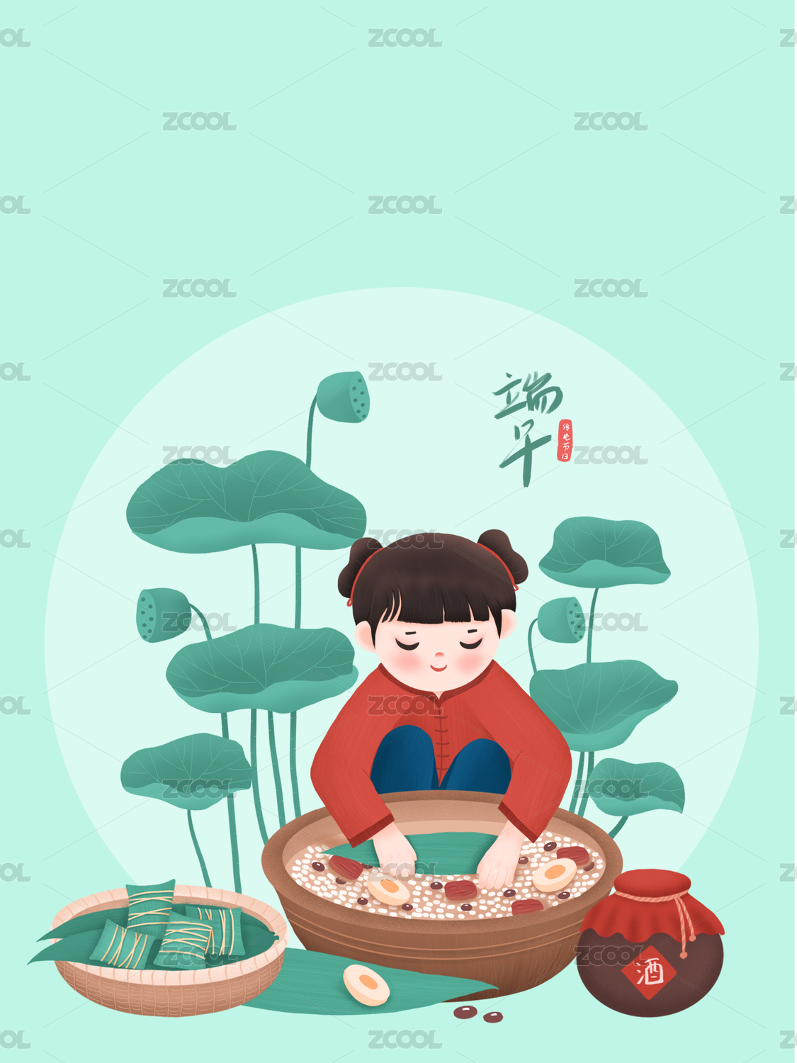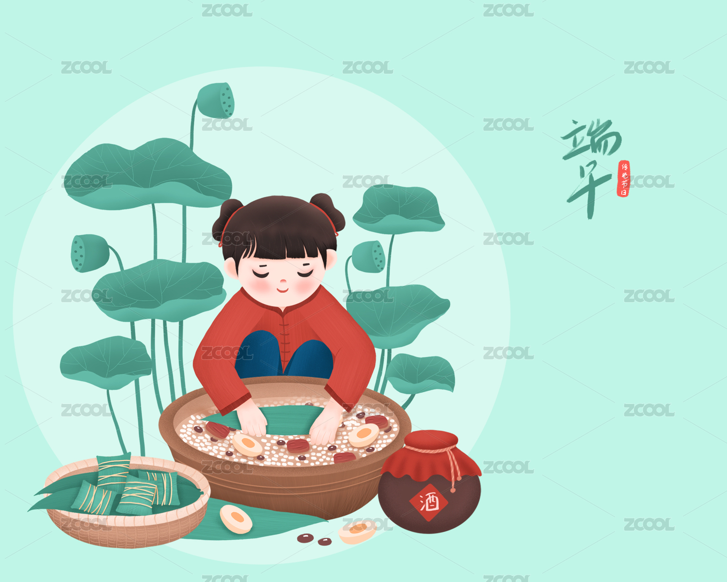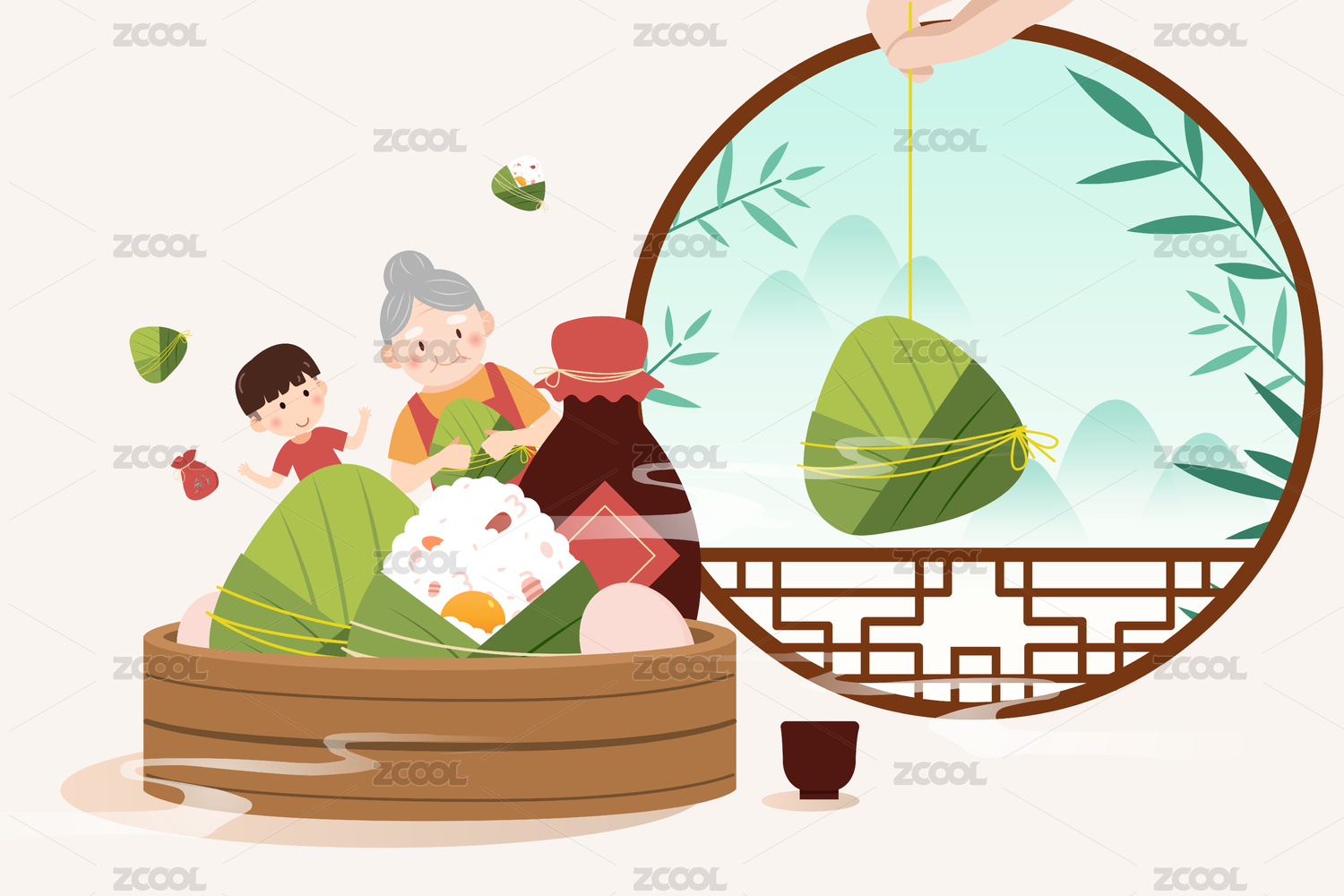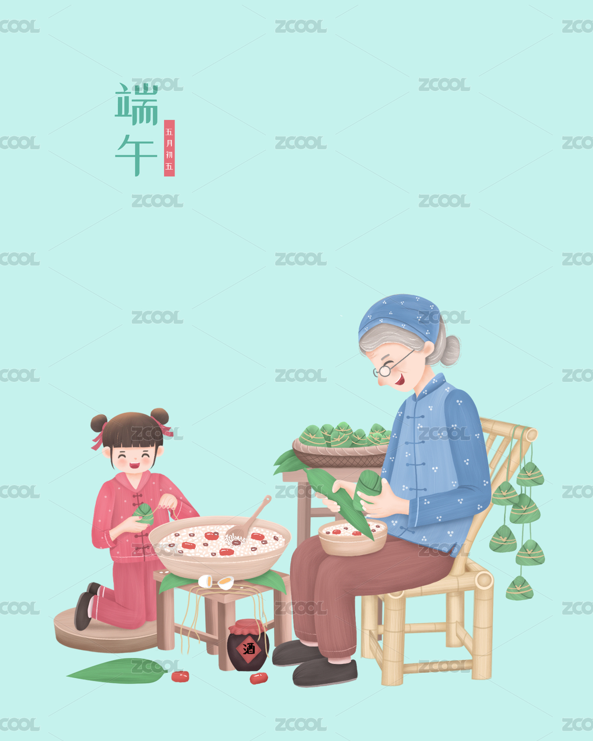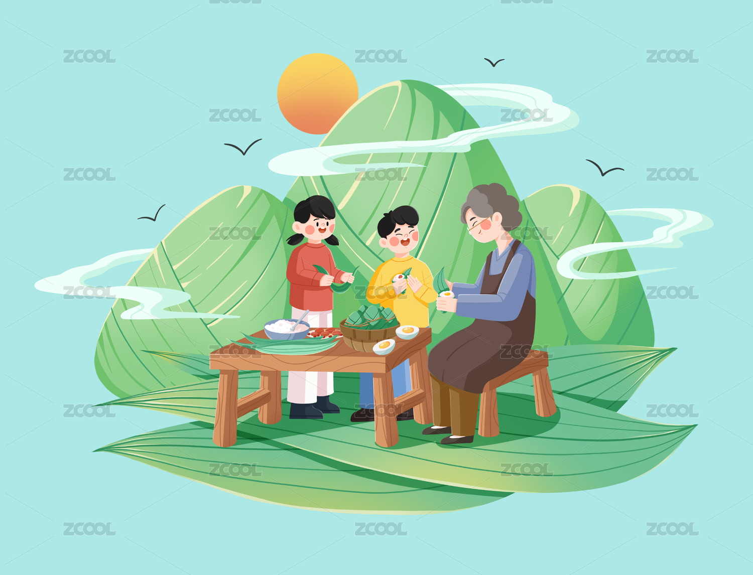 端午节传统节日插画无边:端午和爷爷奶奶一起包粽子