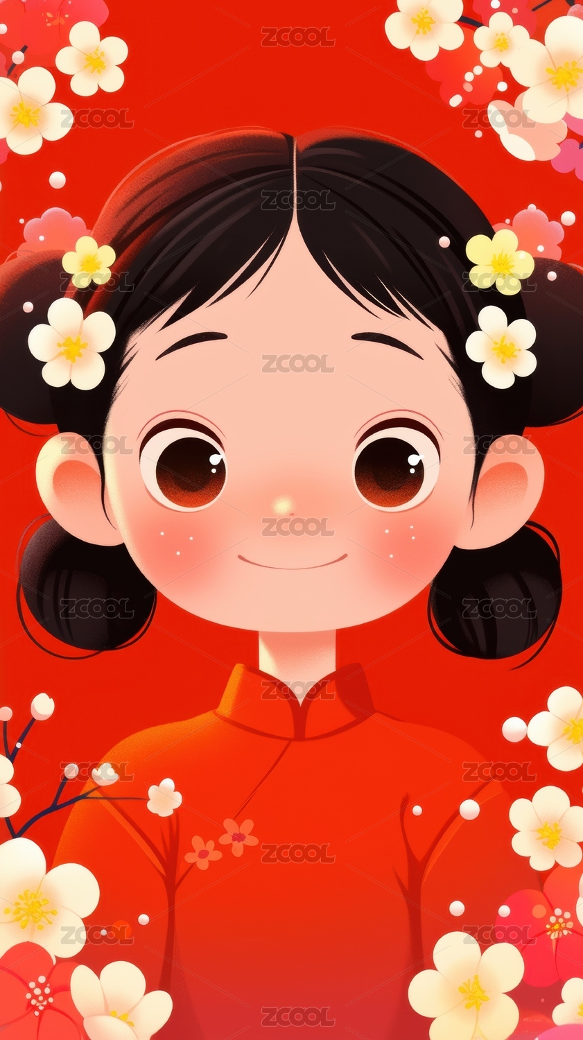 卡通女孩身穿红色服饰周围点缀花卉
