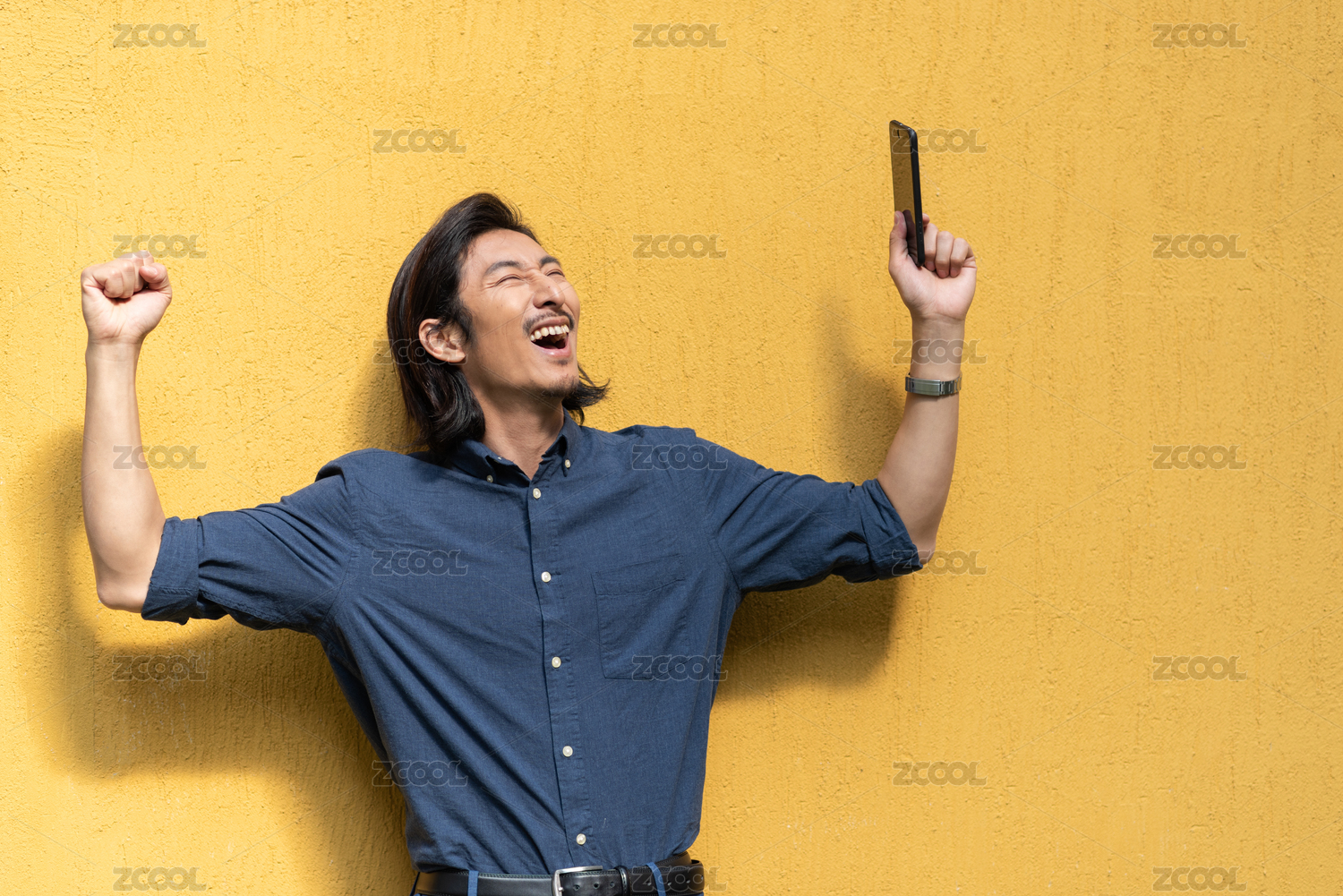 年轻帅气的亚裔男士振臂高呼成功的喜悦
