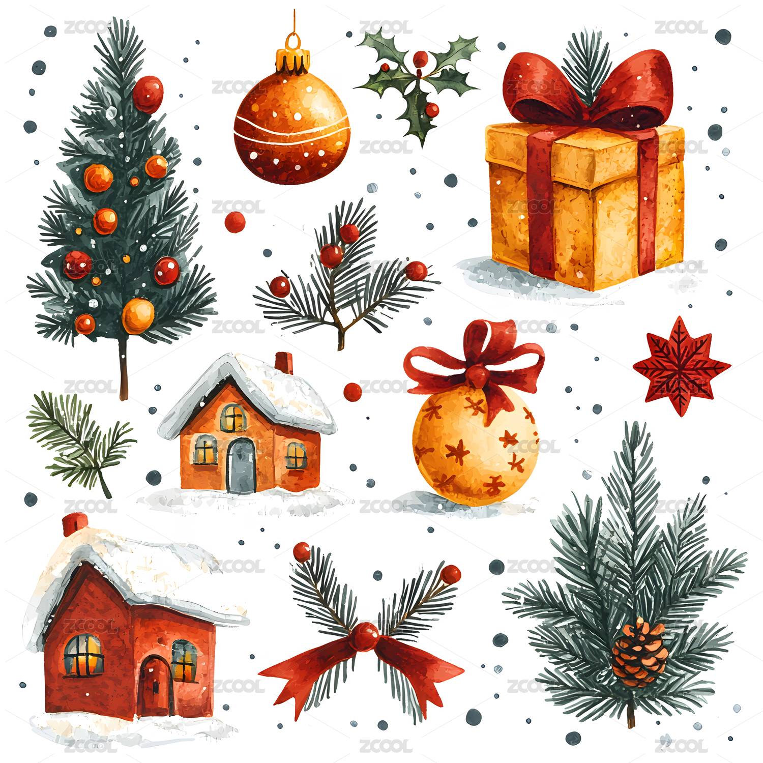 水彩风格圣诞节元素集合
