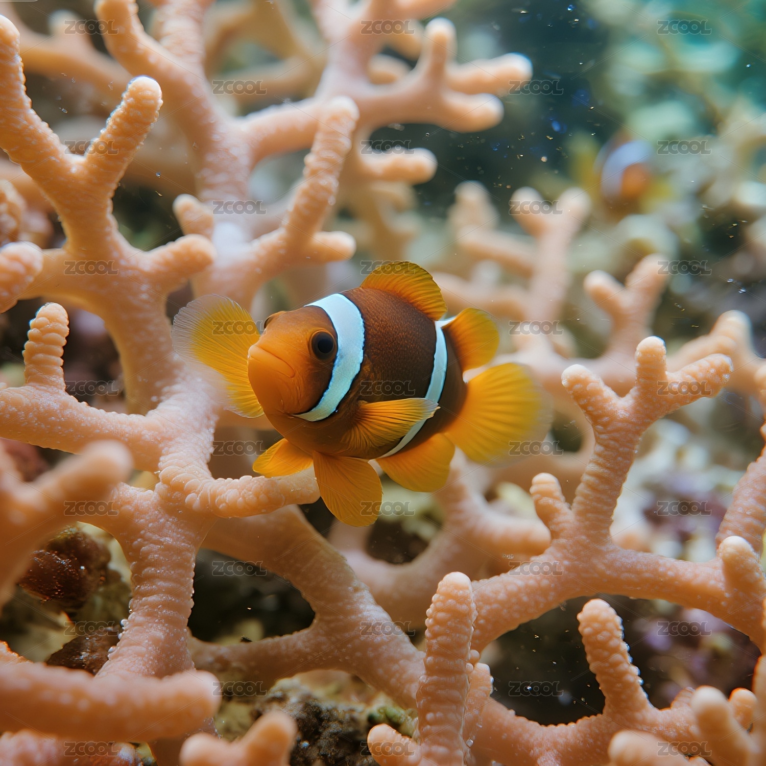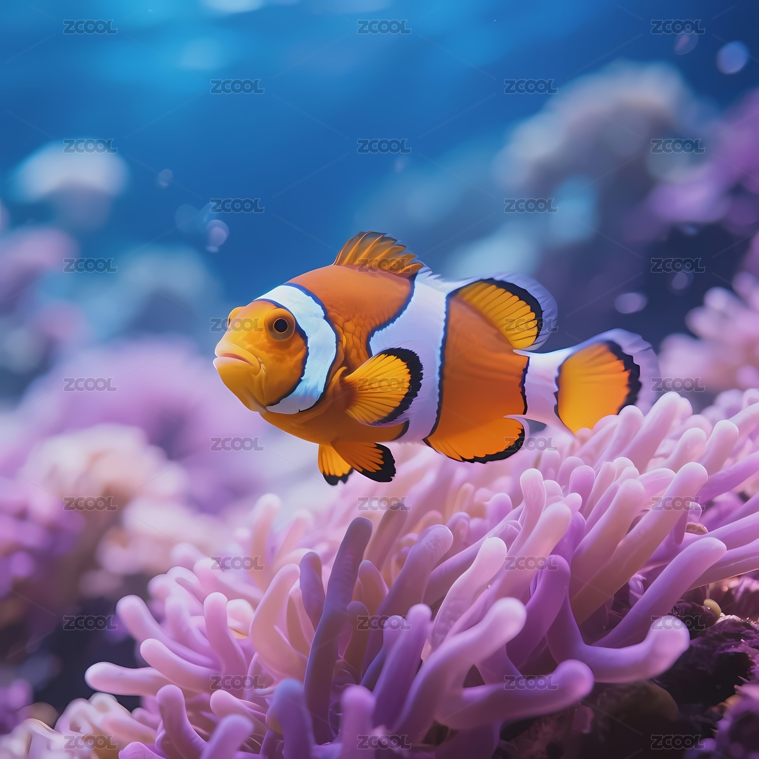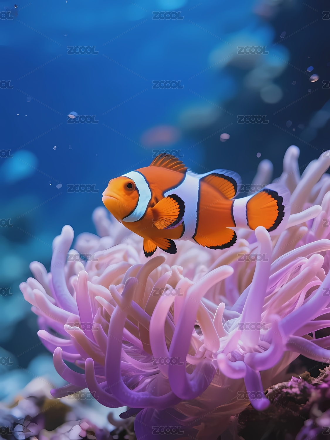 橙白相间的小丑鱼 在紫色珊瑚中游动