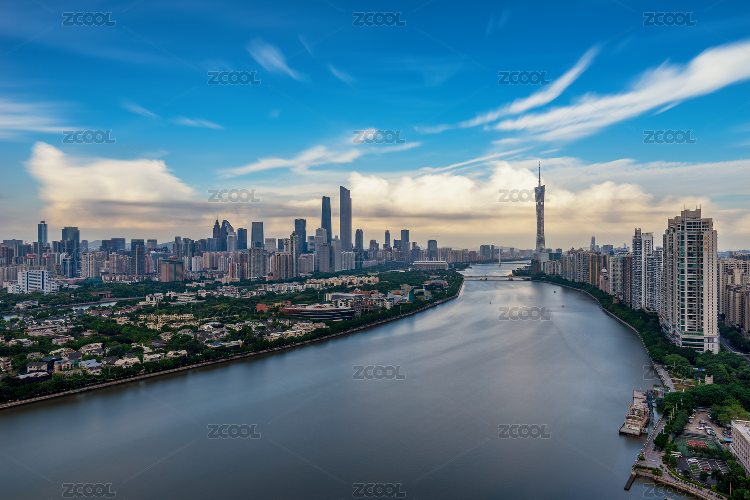 中国,广州,城市,天际线,蓝天,晴朗,全景,市中心,广州塔,珠江新城